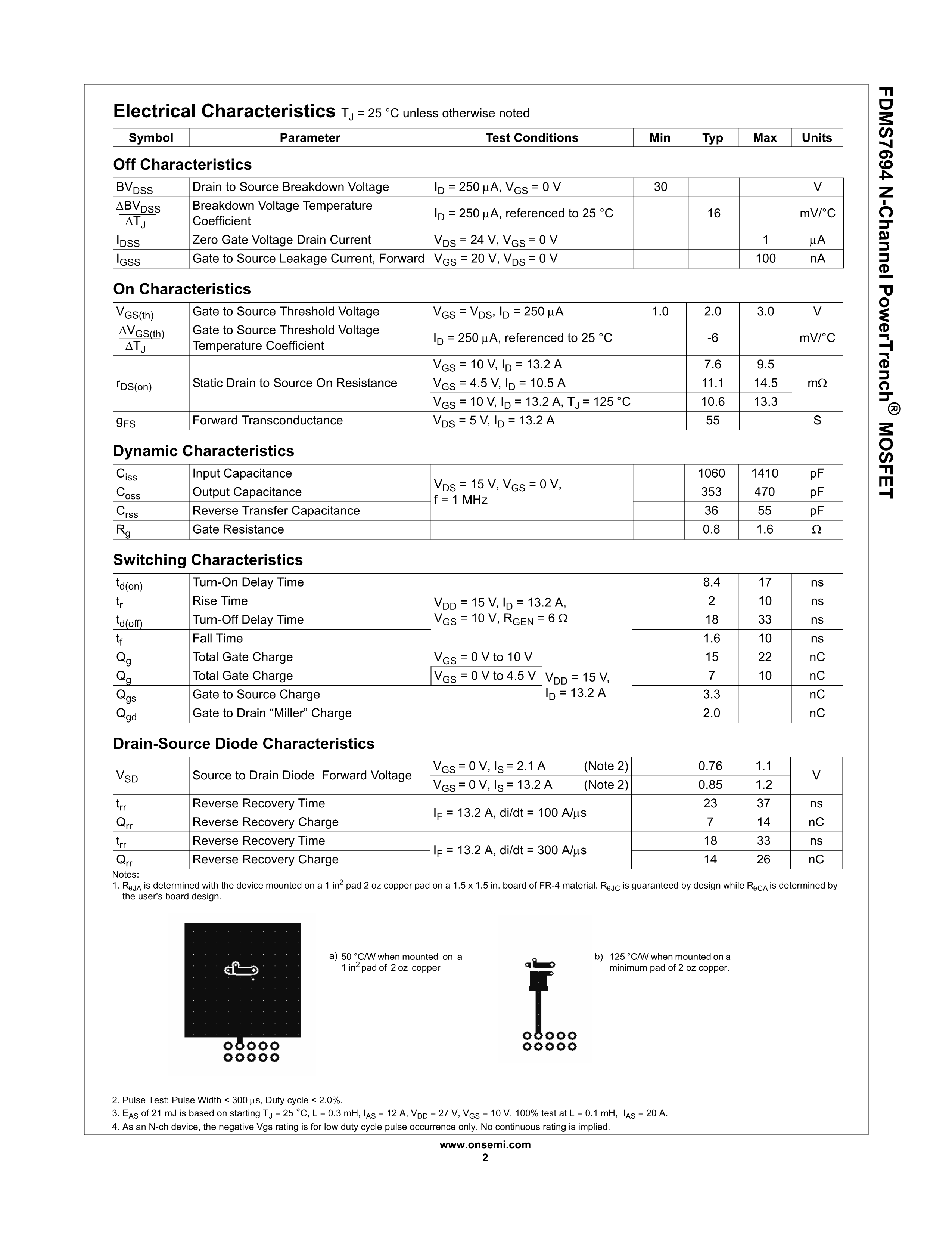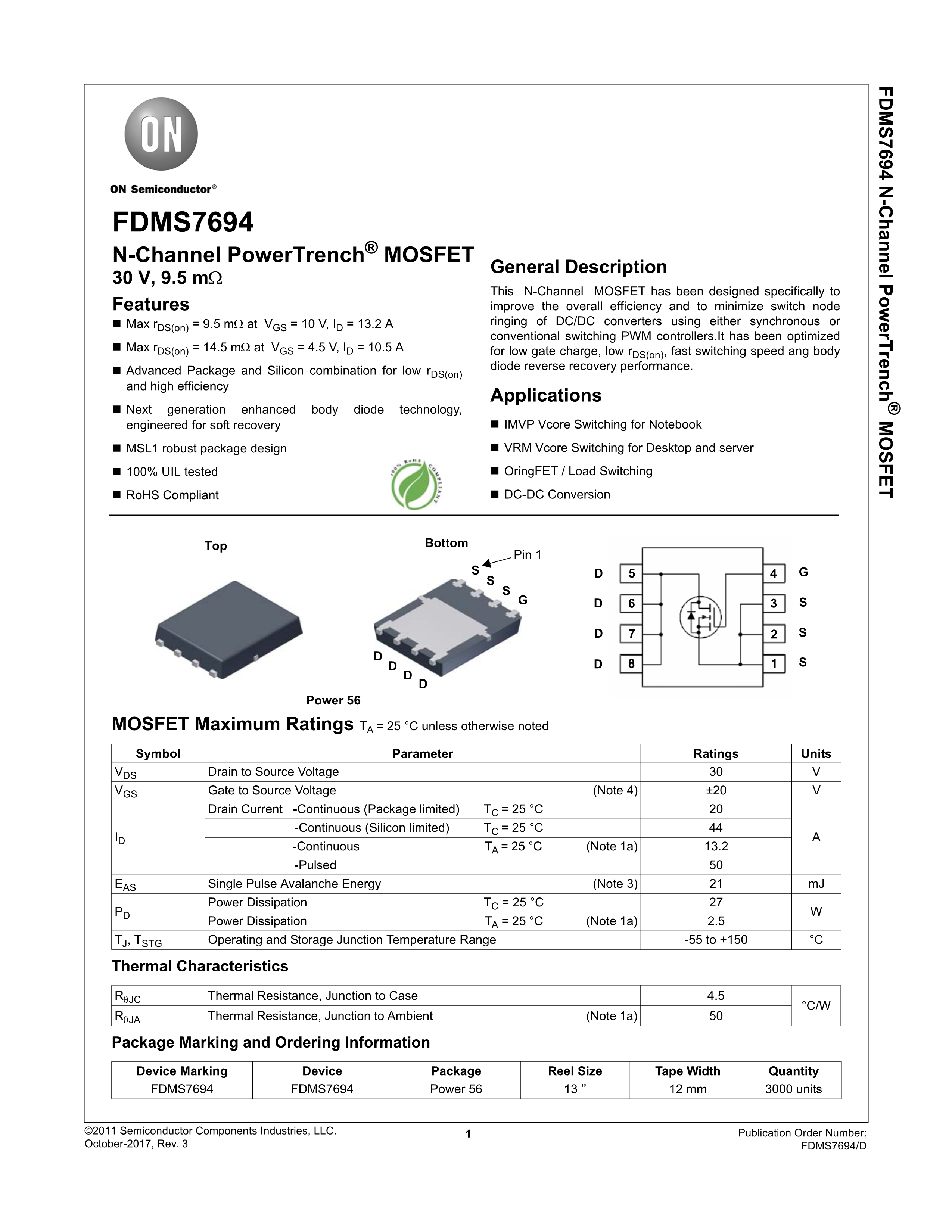 FDMS7694数据手册PQFN-8封装onsemi(安森美)PDF规格书,中英文下载