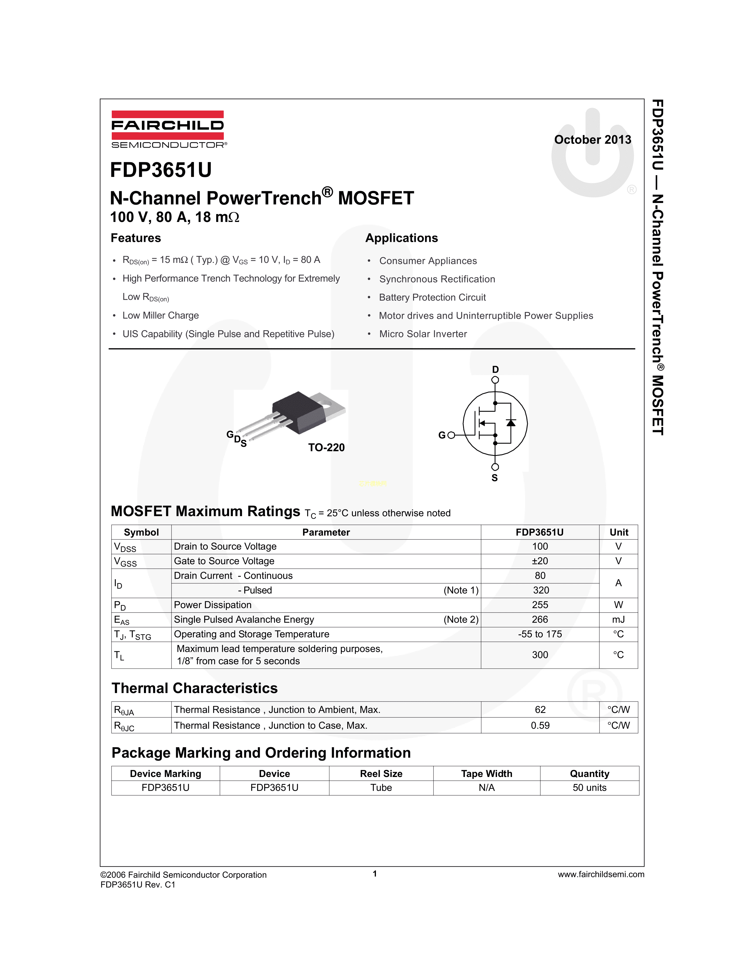 FDP3651U数据手册TO-220封装onsemi(安森美)PDF规格书,中英文下载