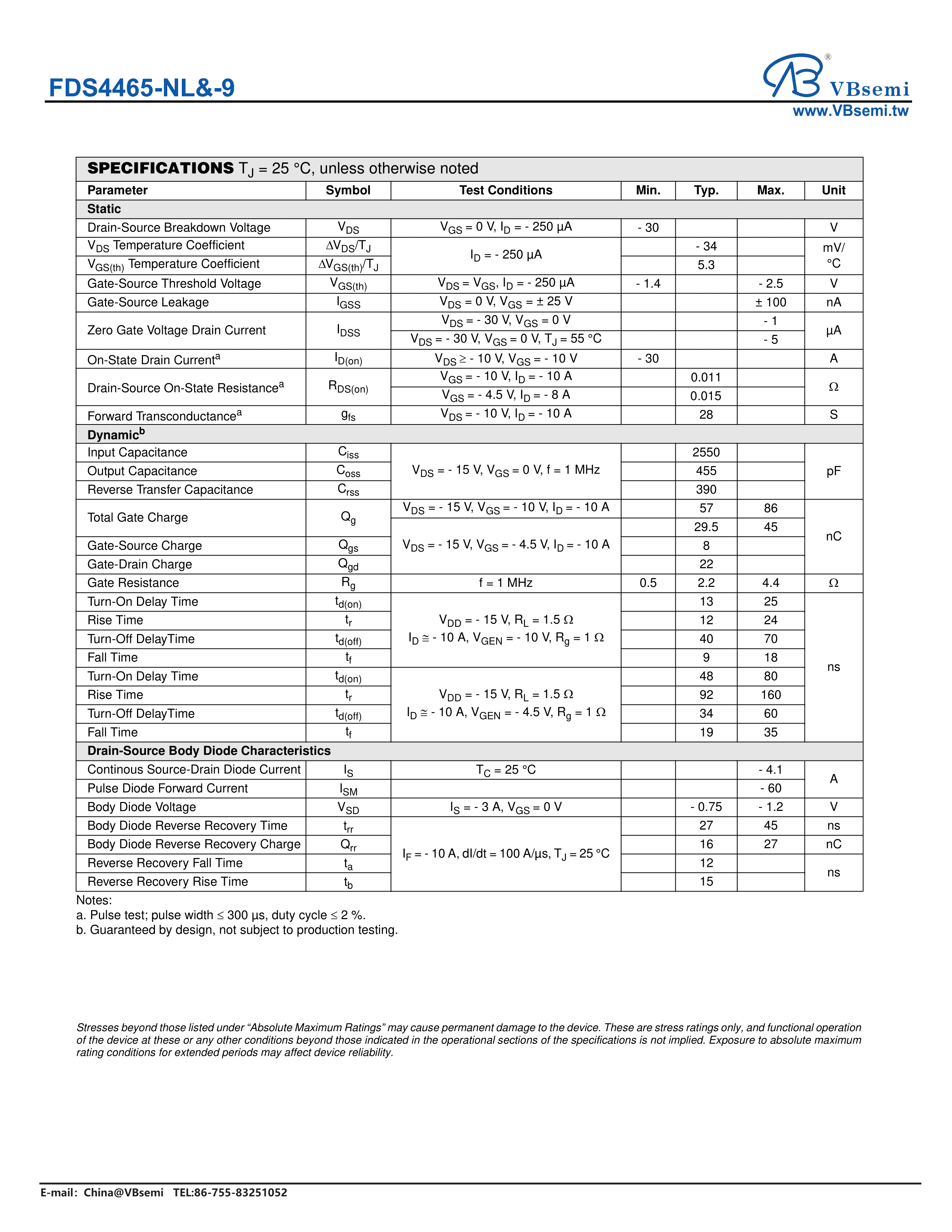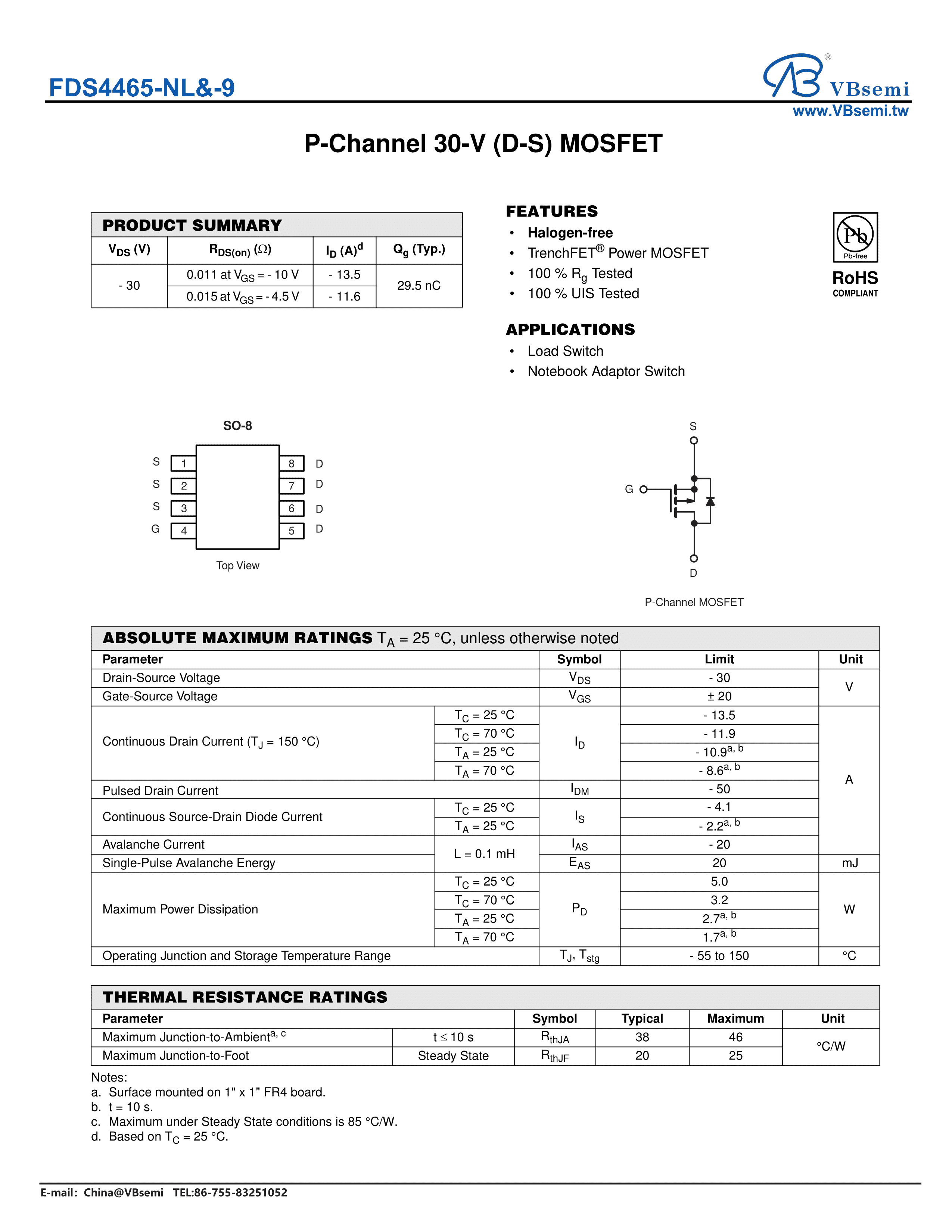 FDS4465-NL&-9数据手册SO-8封装VBsemi(台湾微碧)PDF规格书,中英文下