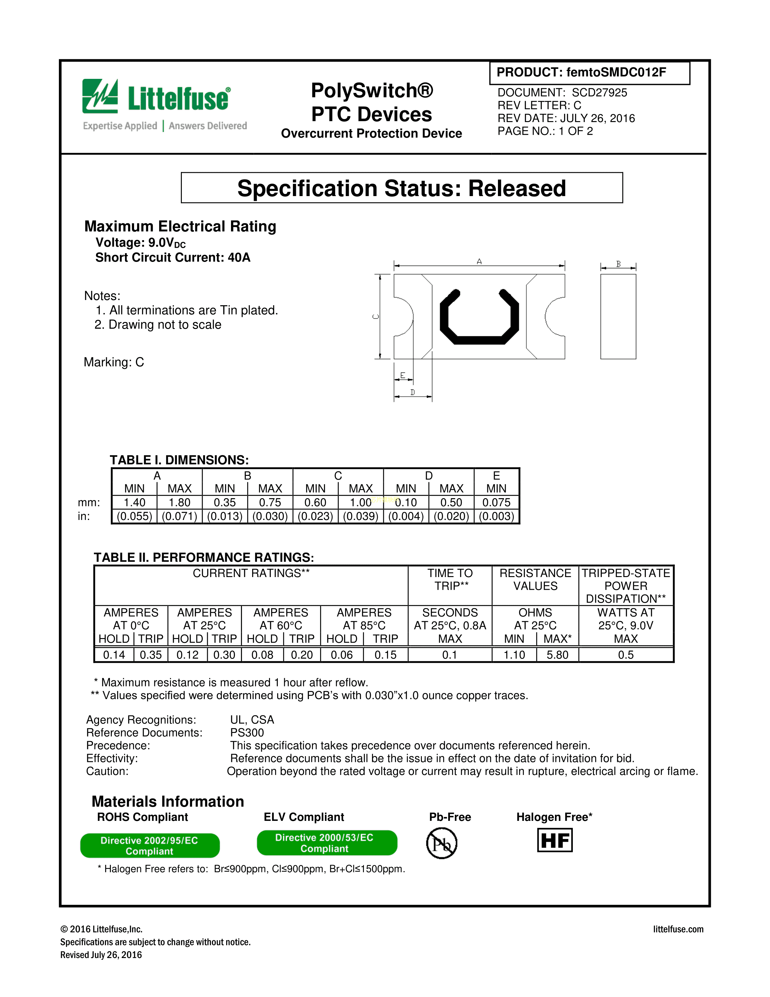 FEMTOSMDC012F-2数据手册0603封装Littelfuse(美国力特)PDF规格书,中英