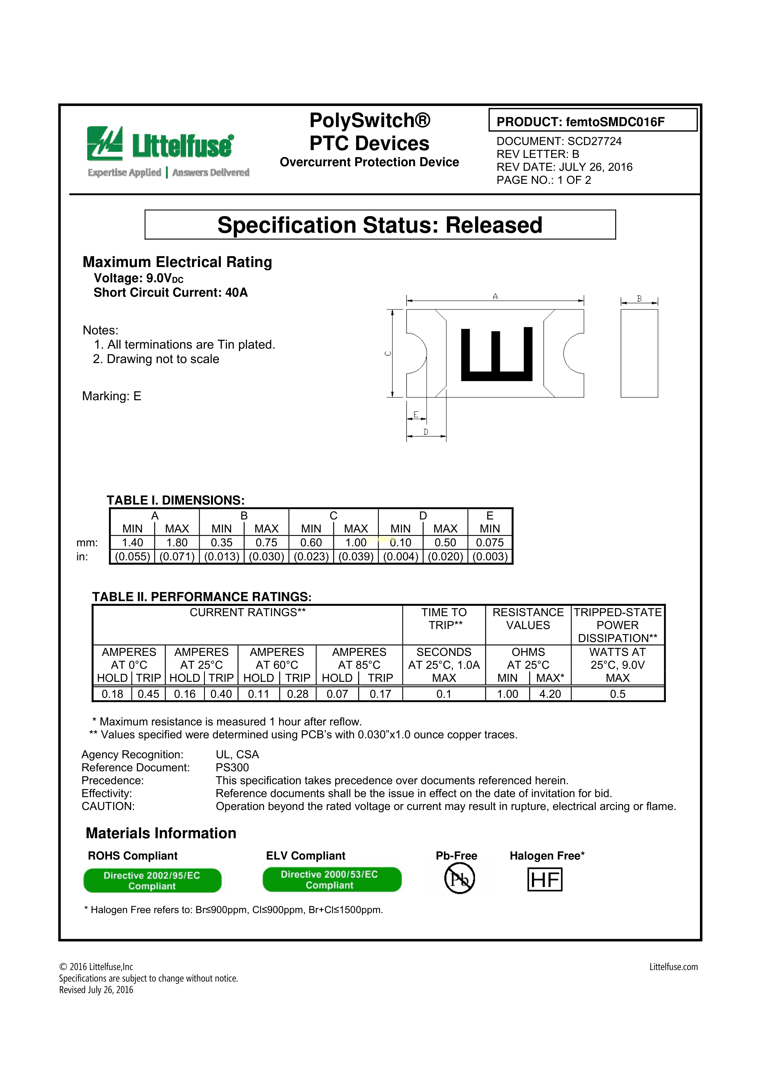 FEMTOSMDC016F-2数据手册0603封装Littelfuse(美国力特)PDF规格书,中英