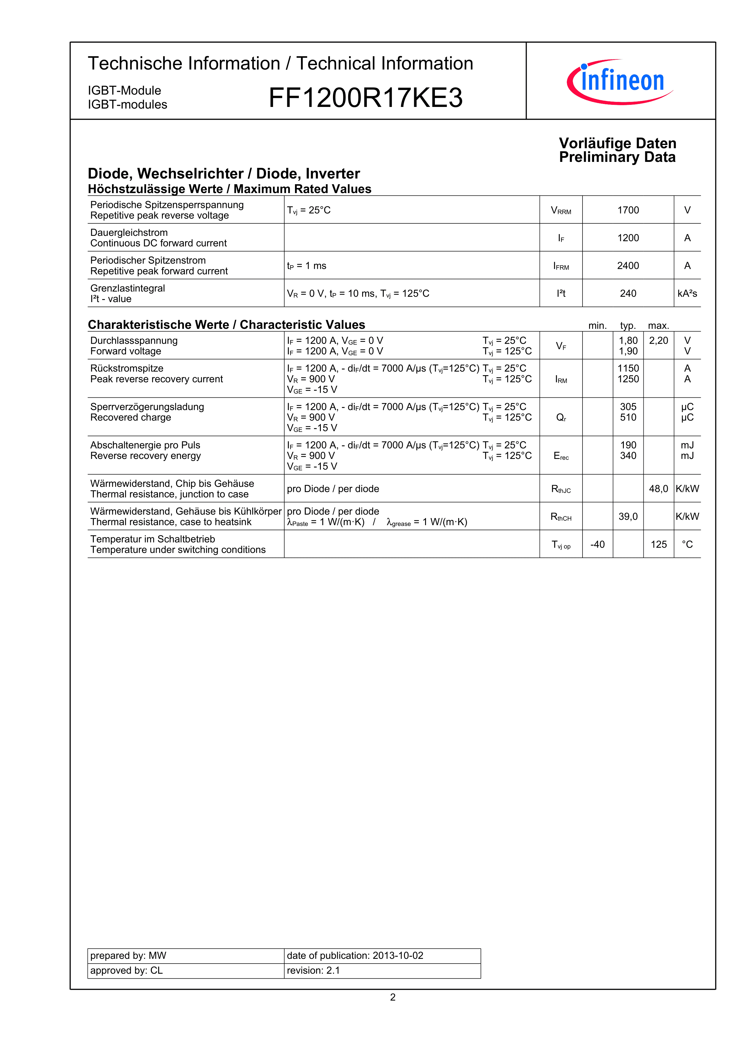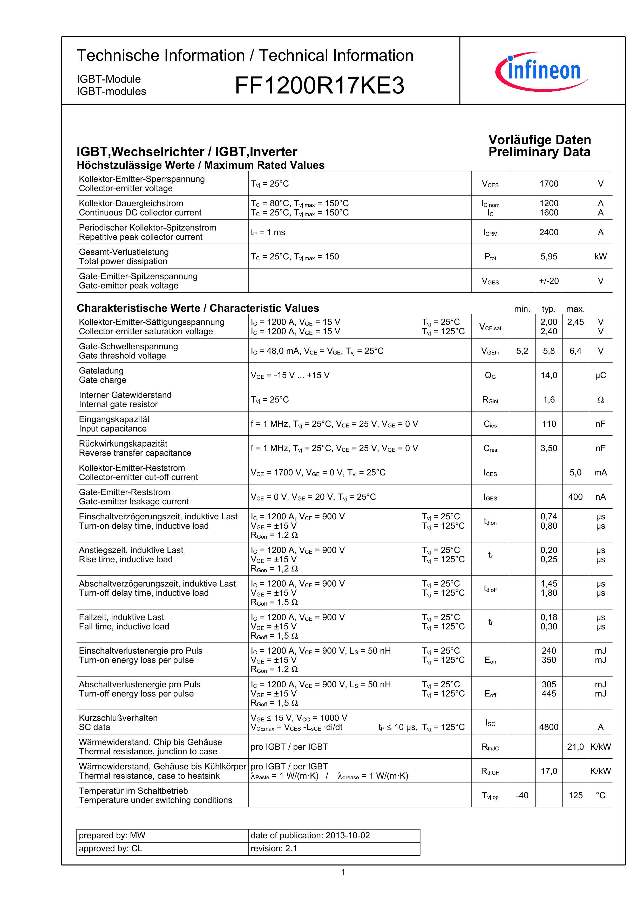 FF1200R17KE3数据手册-封装Infineon(英飞凌)PDF规格书,中英文下载