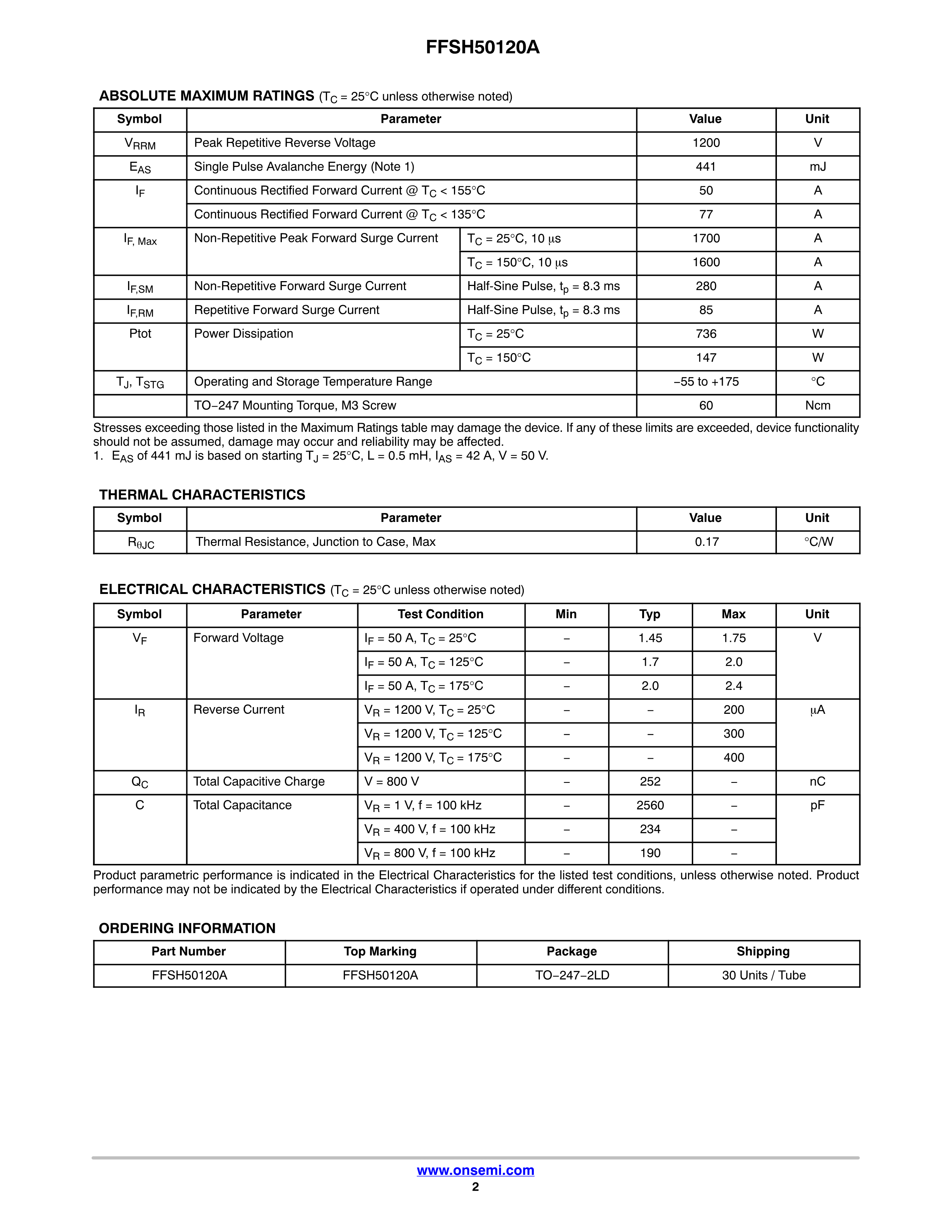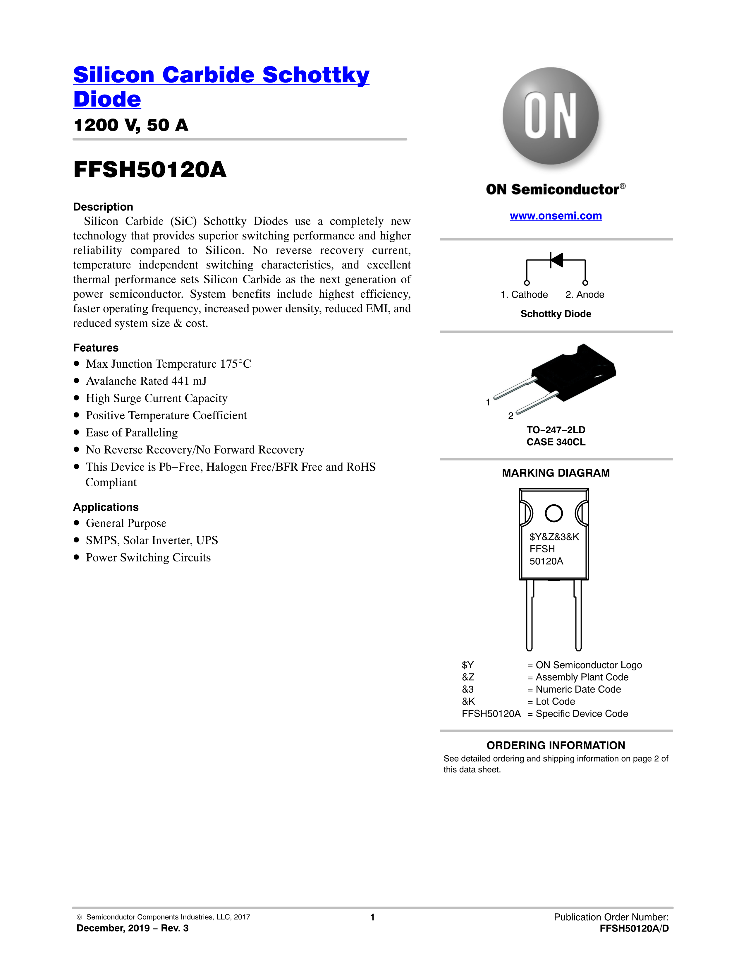 FFSH50120A数据手册TO-247-2封装onsemi(安森美)PDF规格书,中英文下载