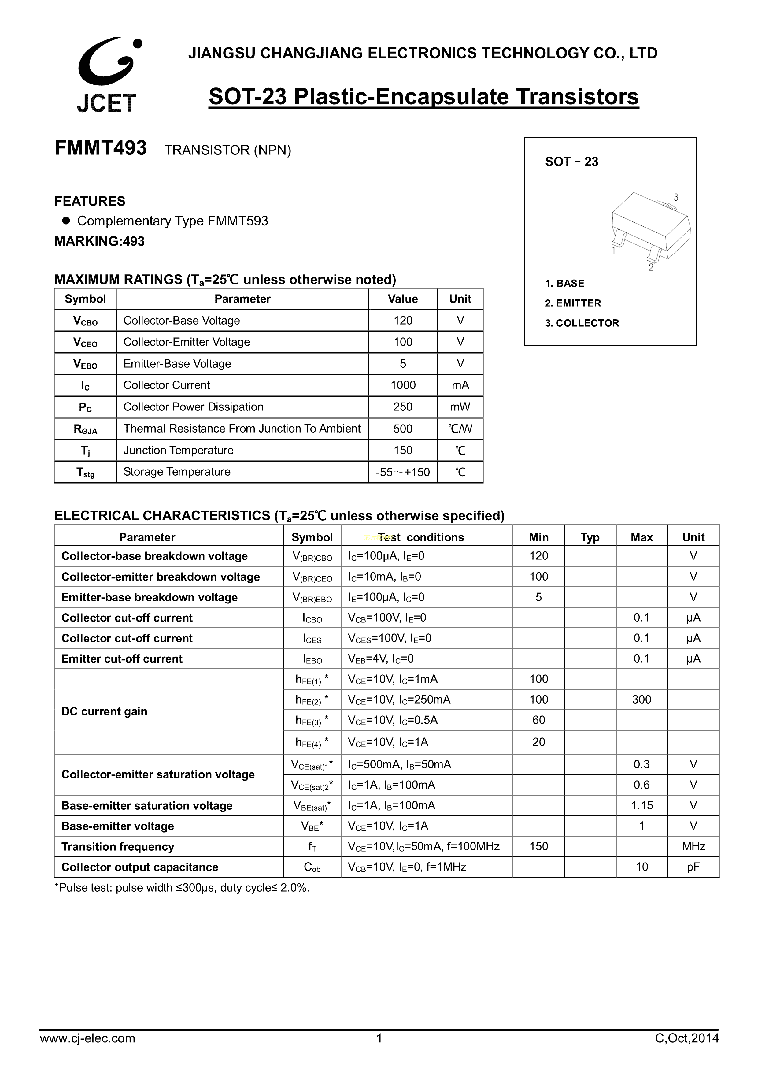 FMMT493数据手册SOT-23(SOT-23-3)封装CJ(江苏长电-长晶)PDF规格书,中英文