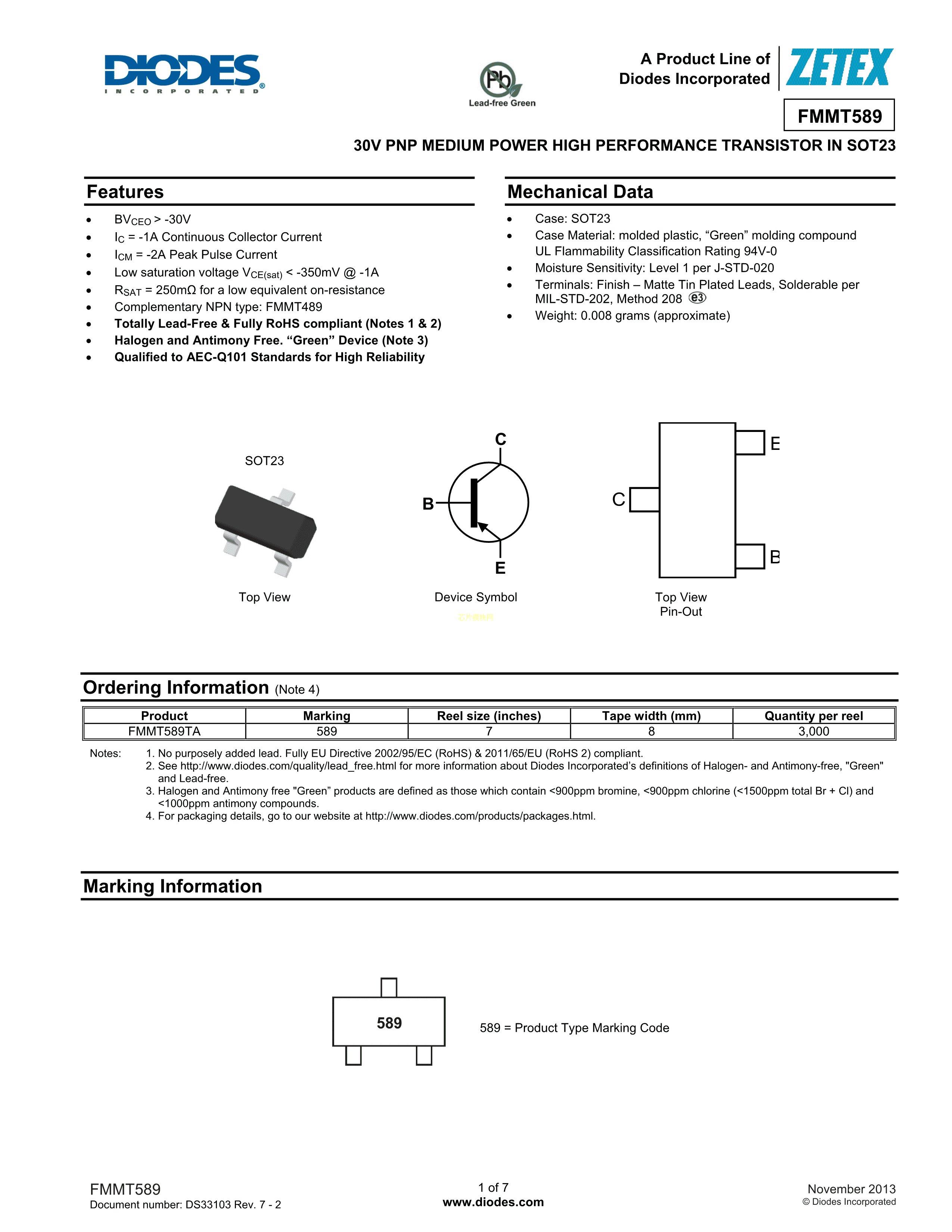 FMMT589TA数据手册SOT-23-3封装DIODES(美台)PDF规格书,中英文下载