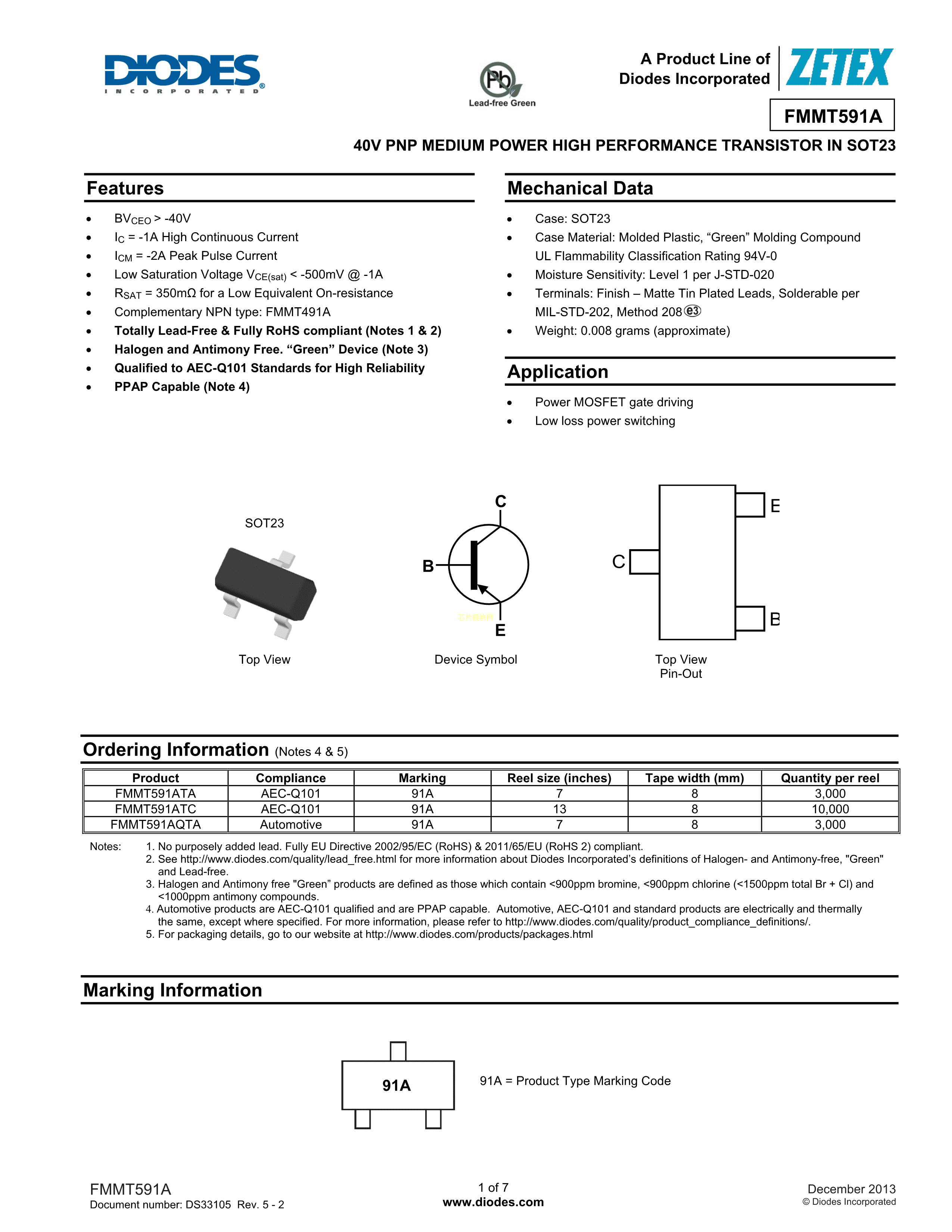 FMMT591ATA数据手册SOT-23封装DIODES(美台)PDF规格书,中英文下载