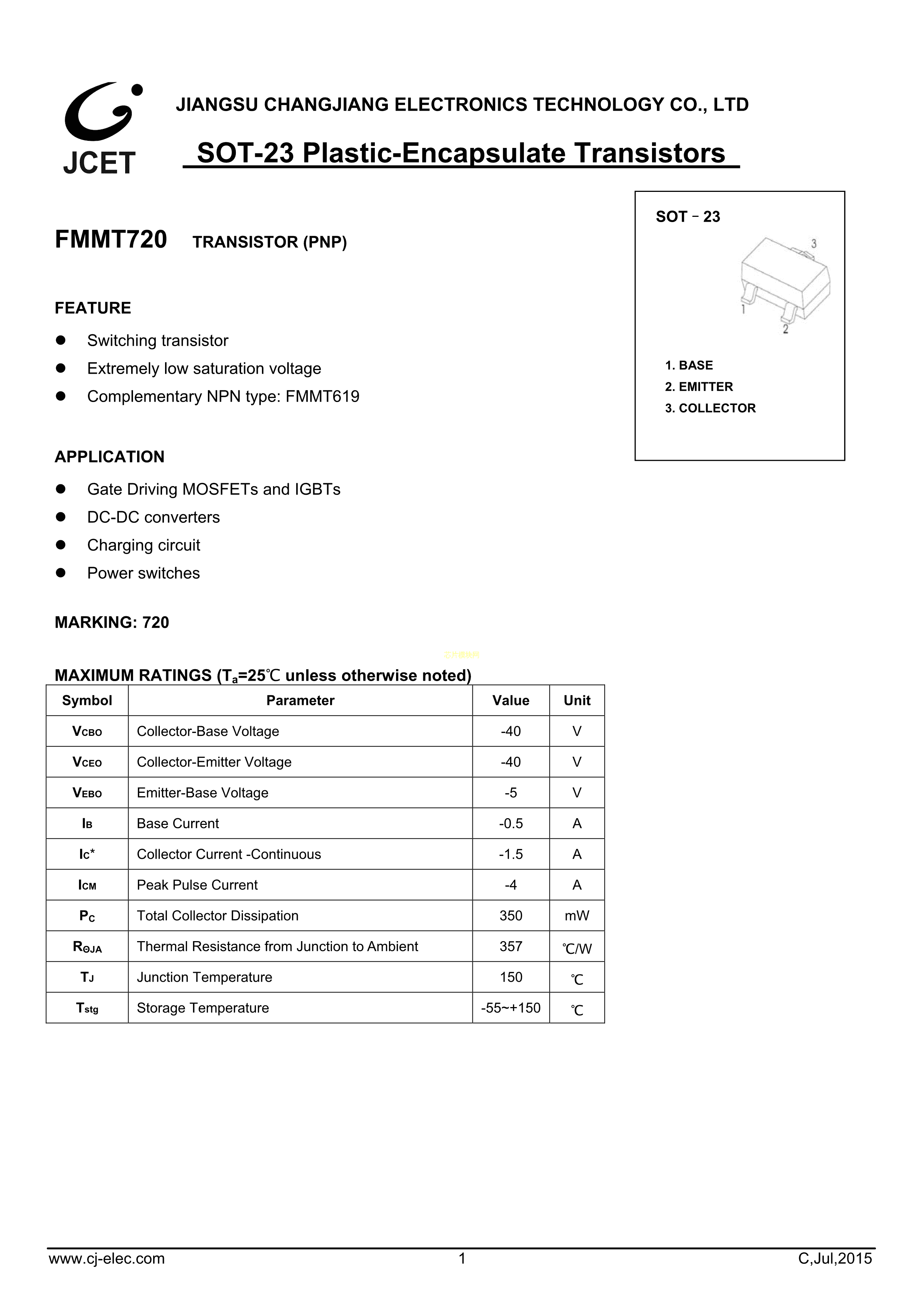 FMMT720数据手册SOT-23(SOT-23-3)封装CJ(江苏长电-长晶)PDF规格书,中英文