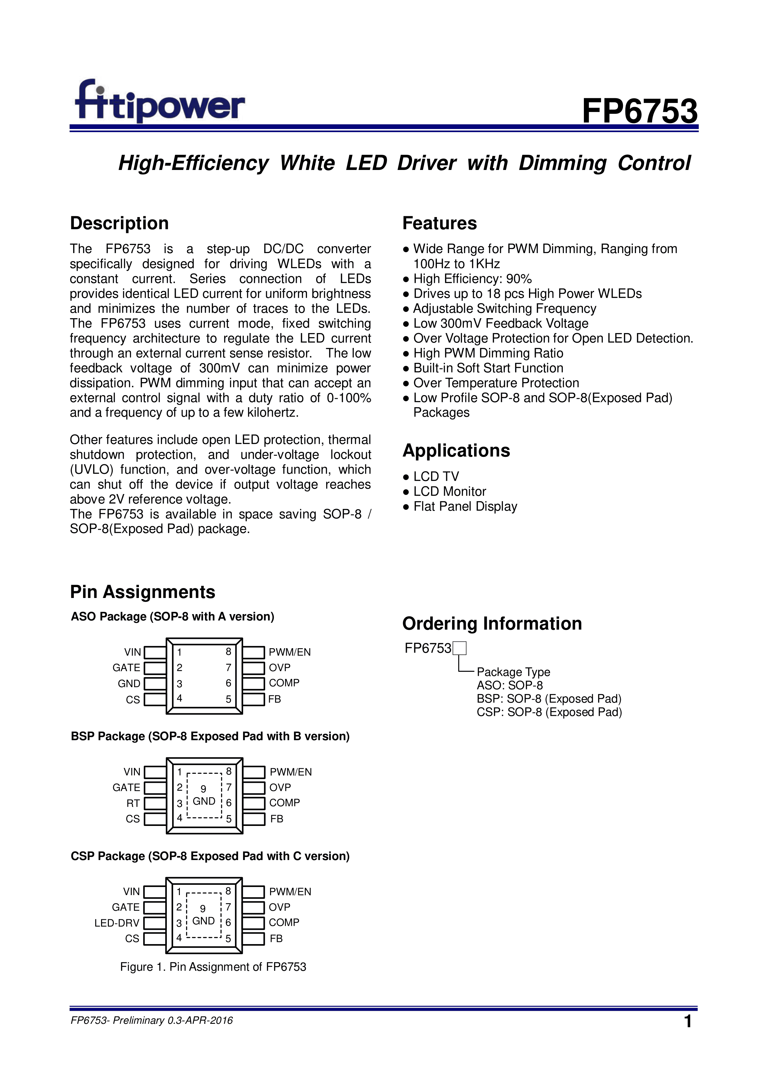FP6753ASO数据手册SOP-8_150mil封装FITIPOWER(天钰)PDF规格书,中英文