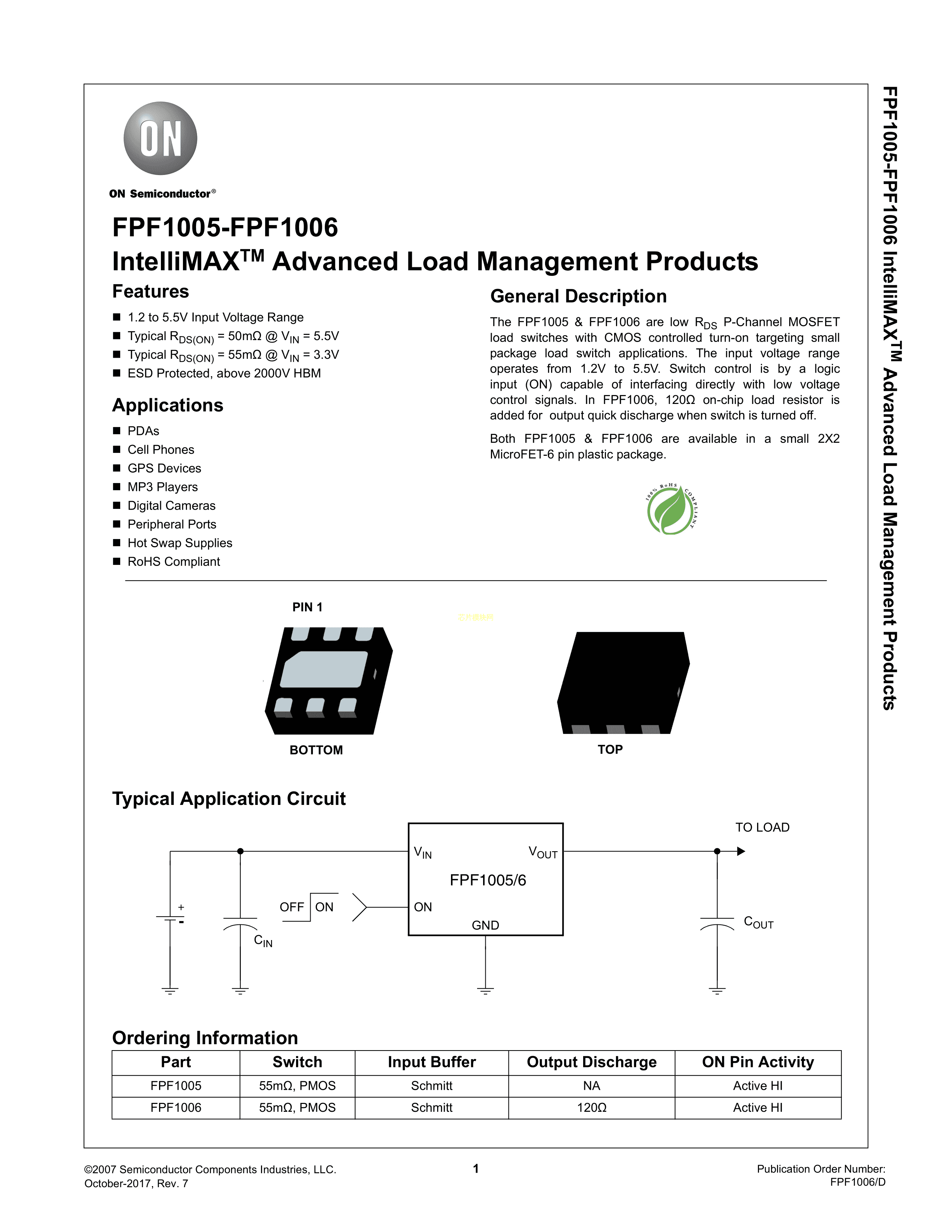 FPF1006数据手册MicroFET-6封装onsemi(安森美)PDF规格书,中英文下载