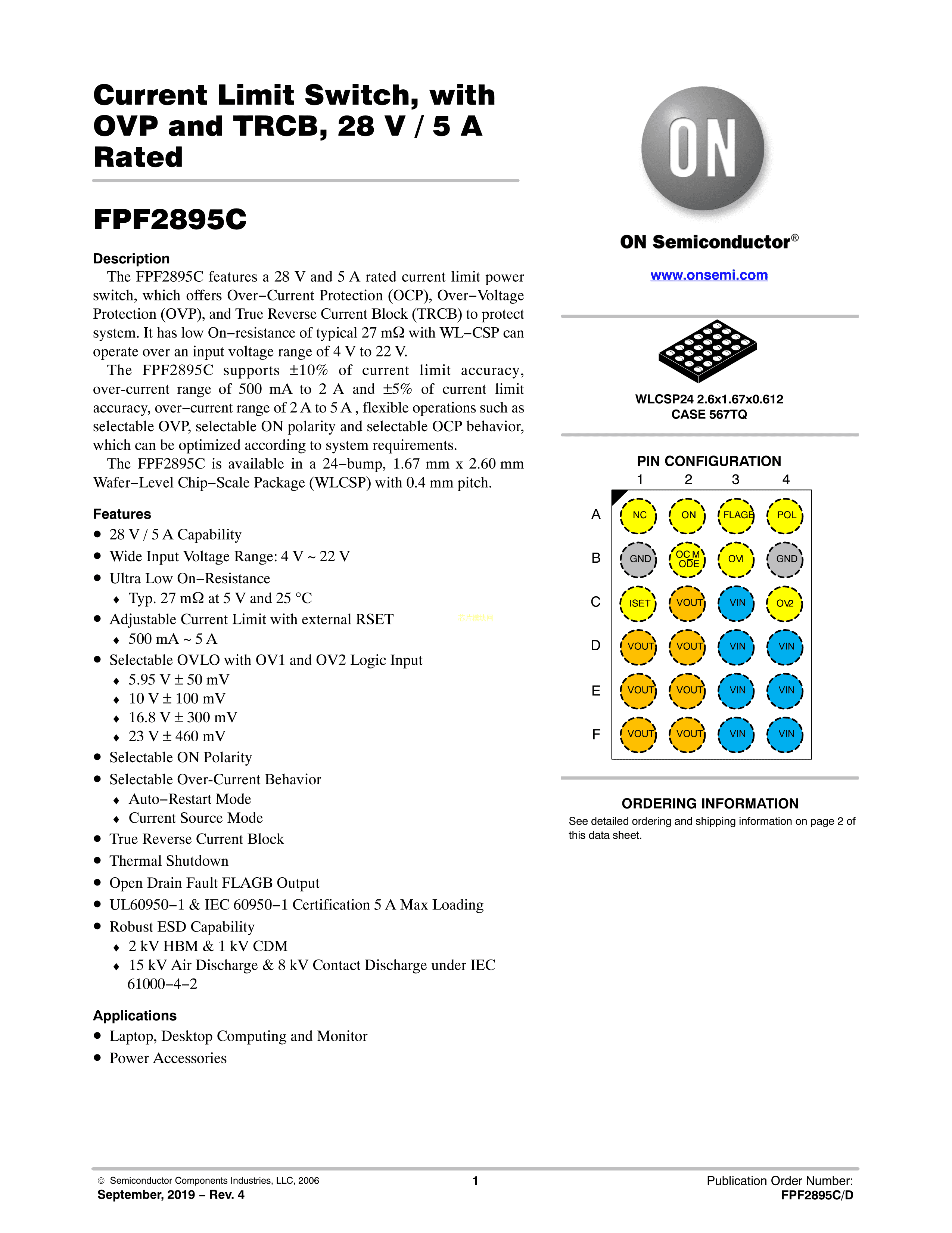 FPF2895CUCX数据手册WLCSP-24封装onsemi(安森美)PDF规格书,中英文下载