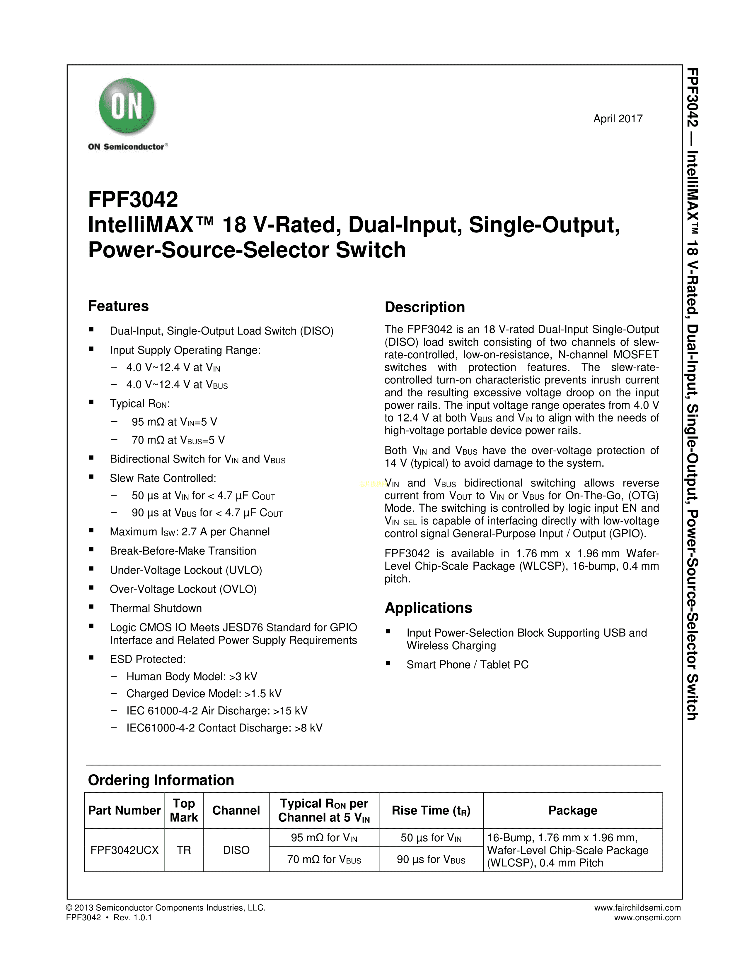 FPF3042UCX数据手册WLCSP-16封装onsemi(安森美)PDF规格书,中英文下载