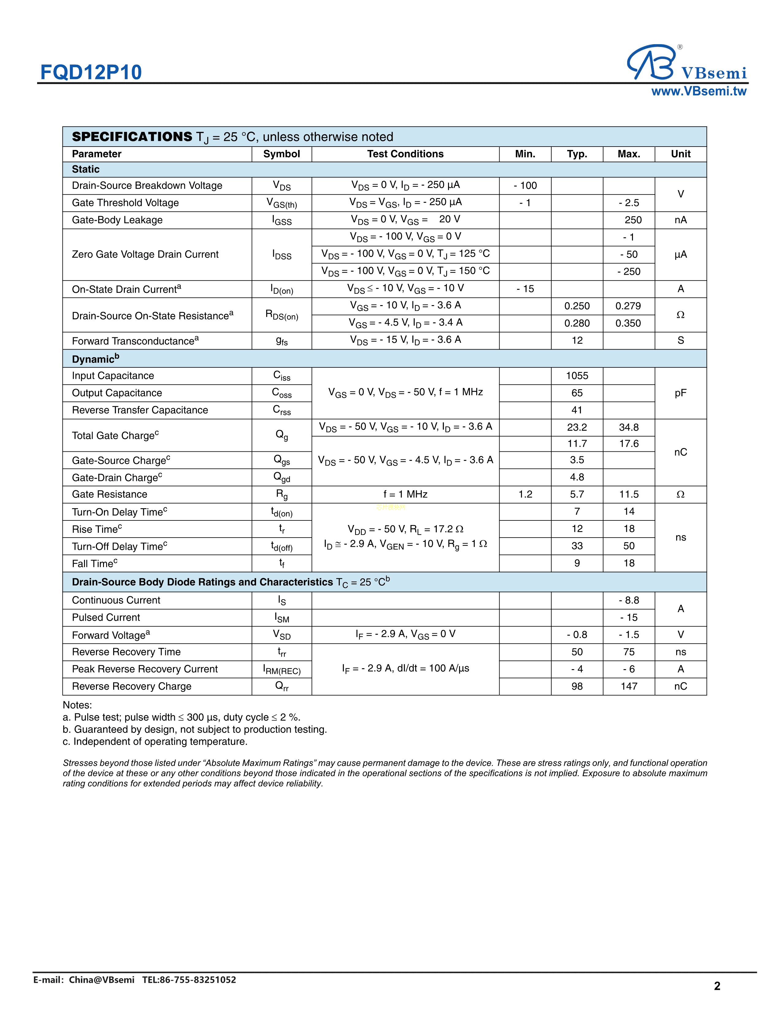 FQD12P10数据手册TO-252封装VBsemi(台湾微碧)PDF规格书,中英文下载