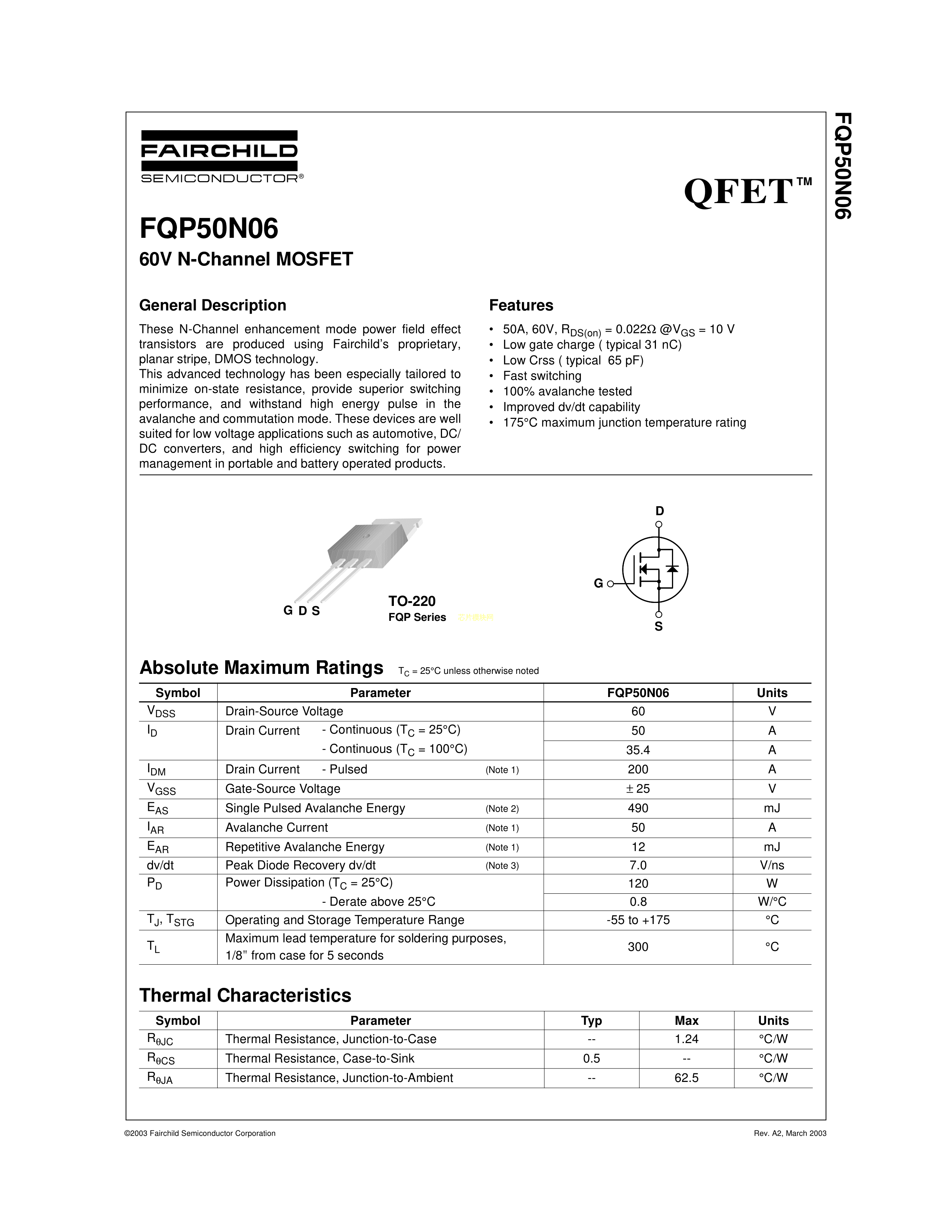 FQP50N06数据手册TO-220(TO-220-3)封装onsemi(安森美)PDF规格书,中英文下载