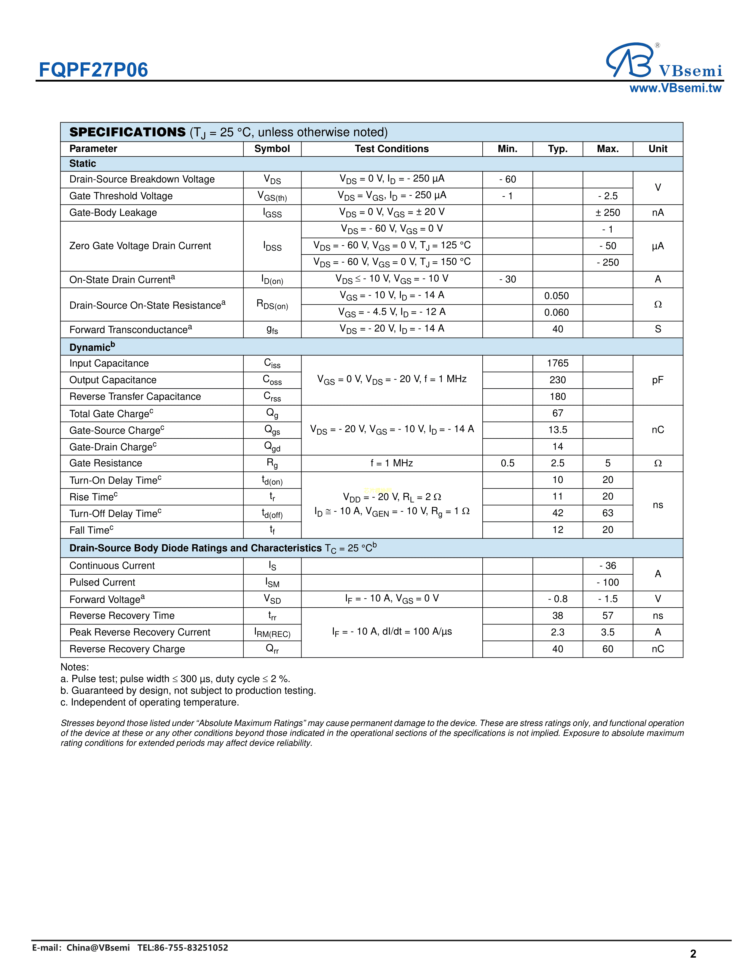FQPF27P06数据手册TO-220F封装VBsemi(台湾微碧)PDF规格书,中英文下载