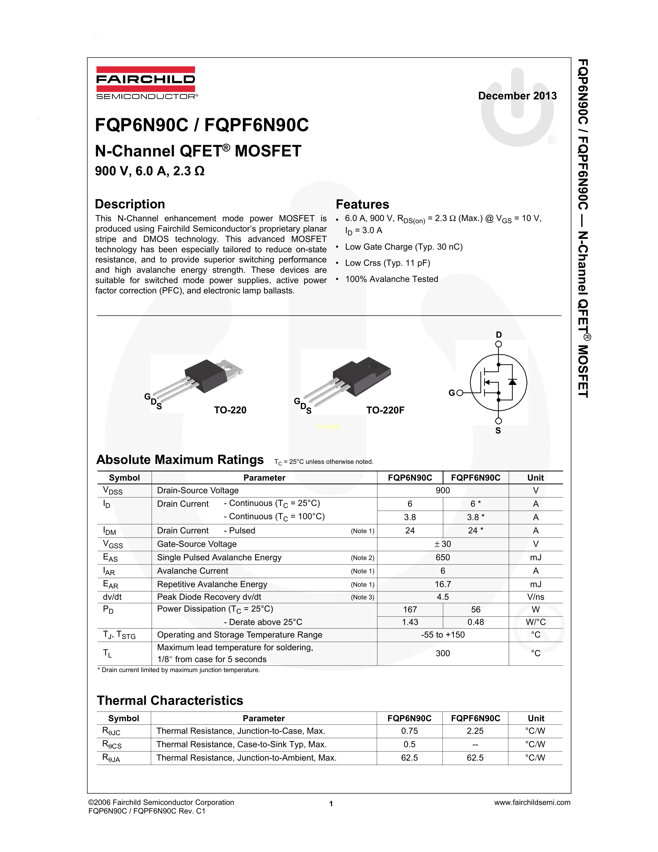 FQPF6N90C数据手册TO-220F(TO-220IS)封装onsemi(安森美)PDF规格书,中英文下载