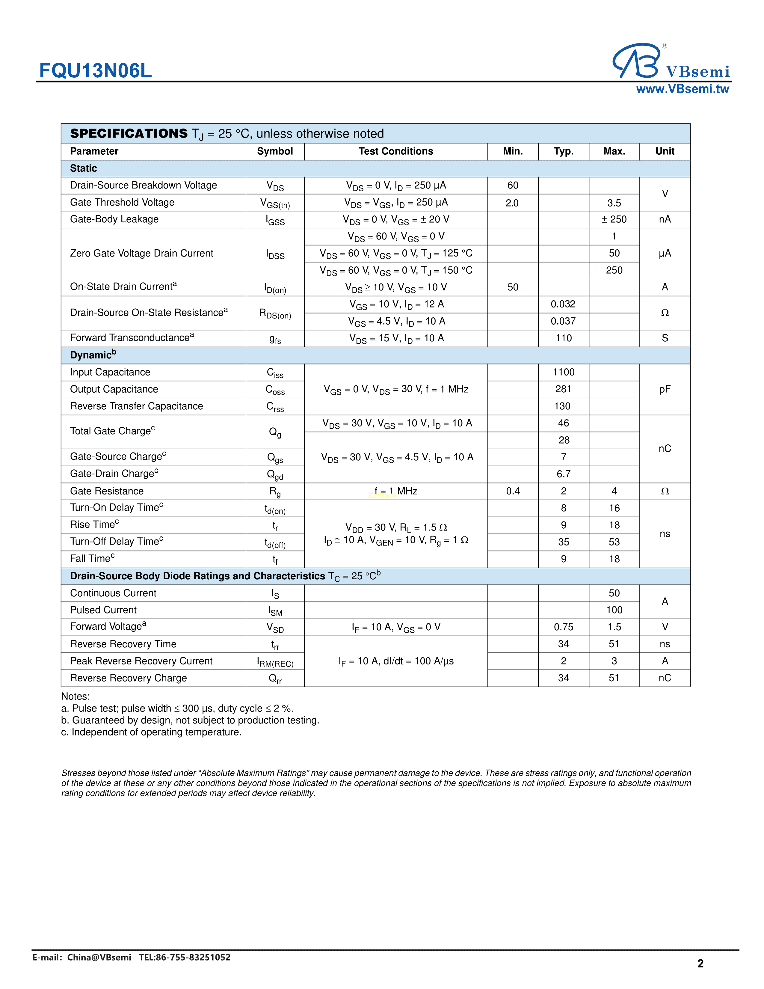 FQU13N06L数据手册TO-251封装VBsemi(台湾微碧)PDF规格书,中英文下载