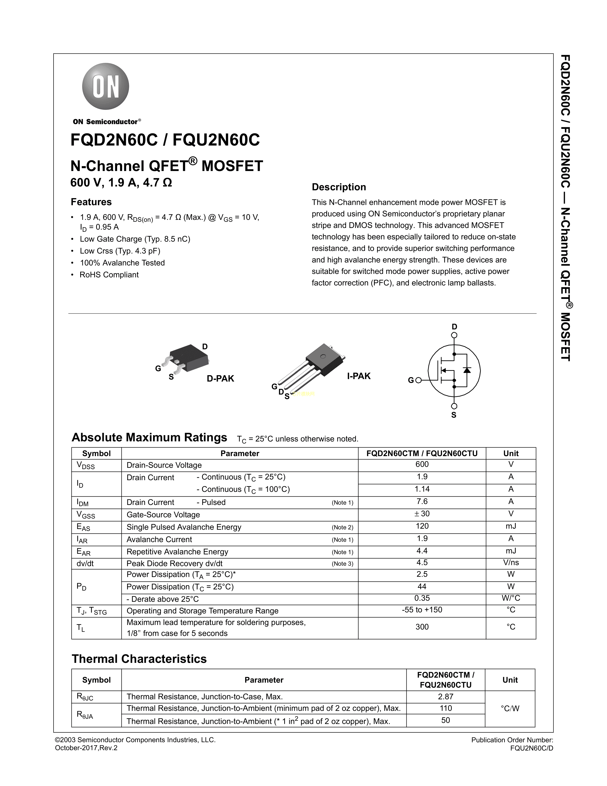 FQU2N60CTU数据手册TO-251-3封装onsemi(安森美)PDF规格书,中英文下载