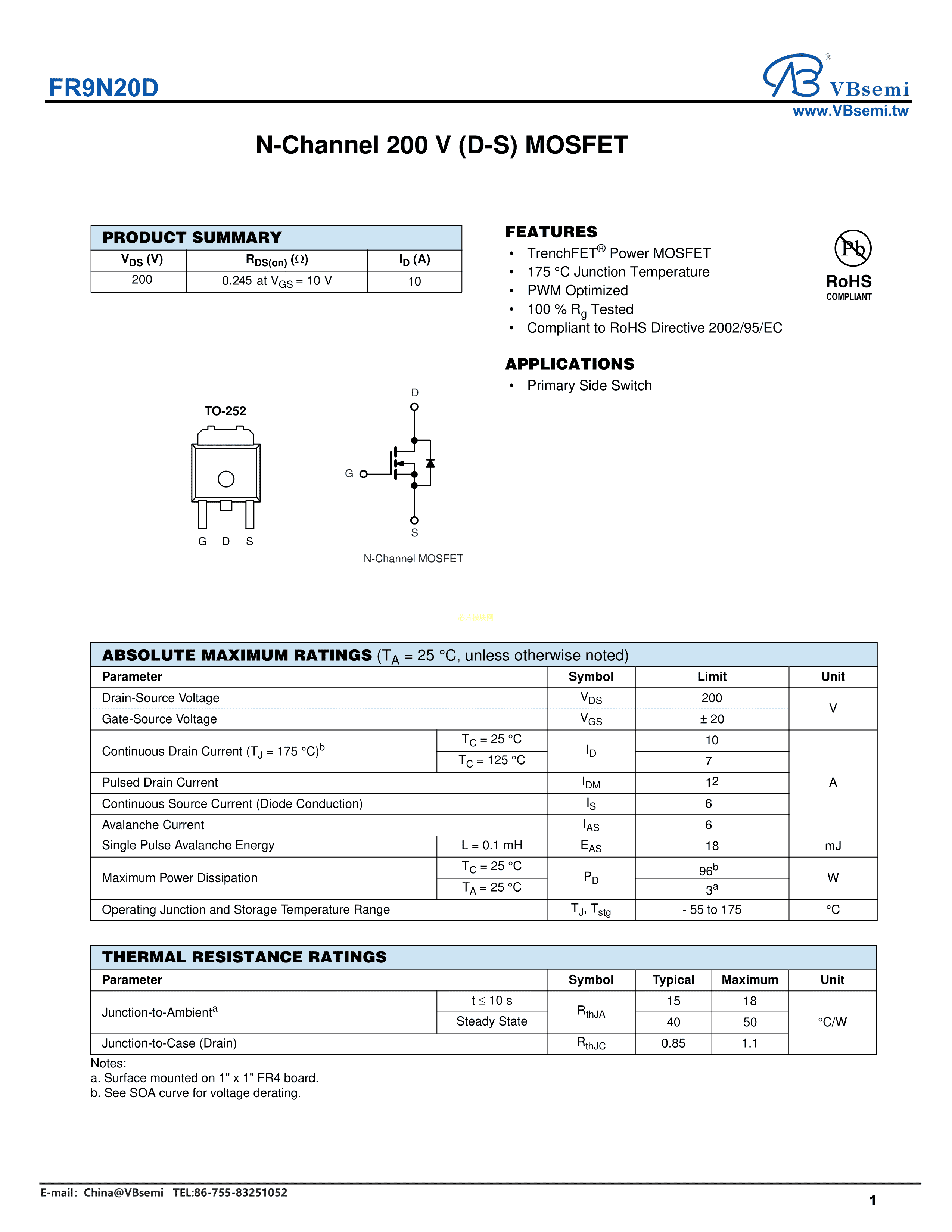 FR9N20D数据手册TO-252封装VBsemi(台湾微碧)PDF规格书,中英文下载