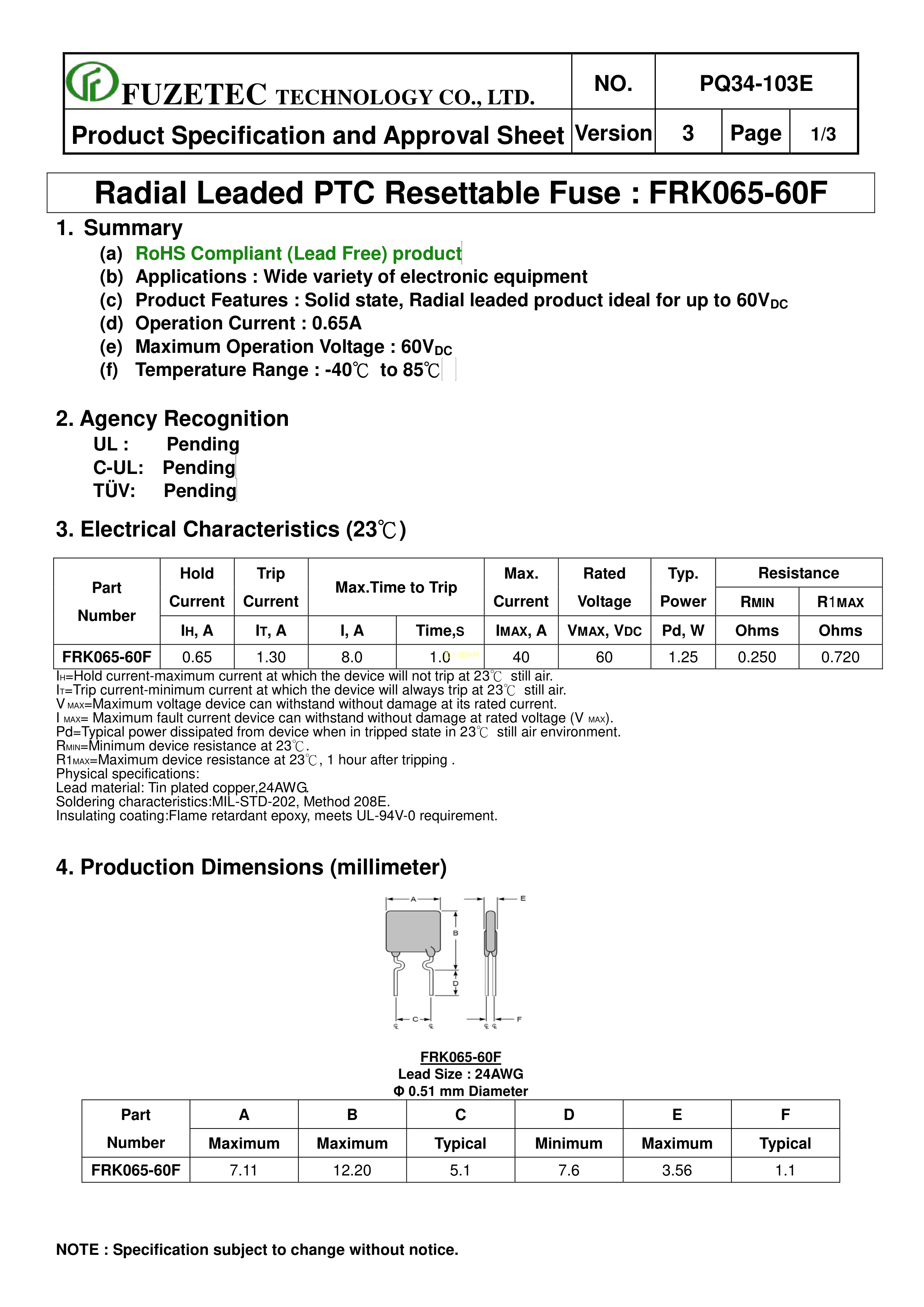 FRK065-60F数据手册径向引线封装FUZETEC(台湾富致)PDF规格书,中英文下载