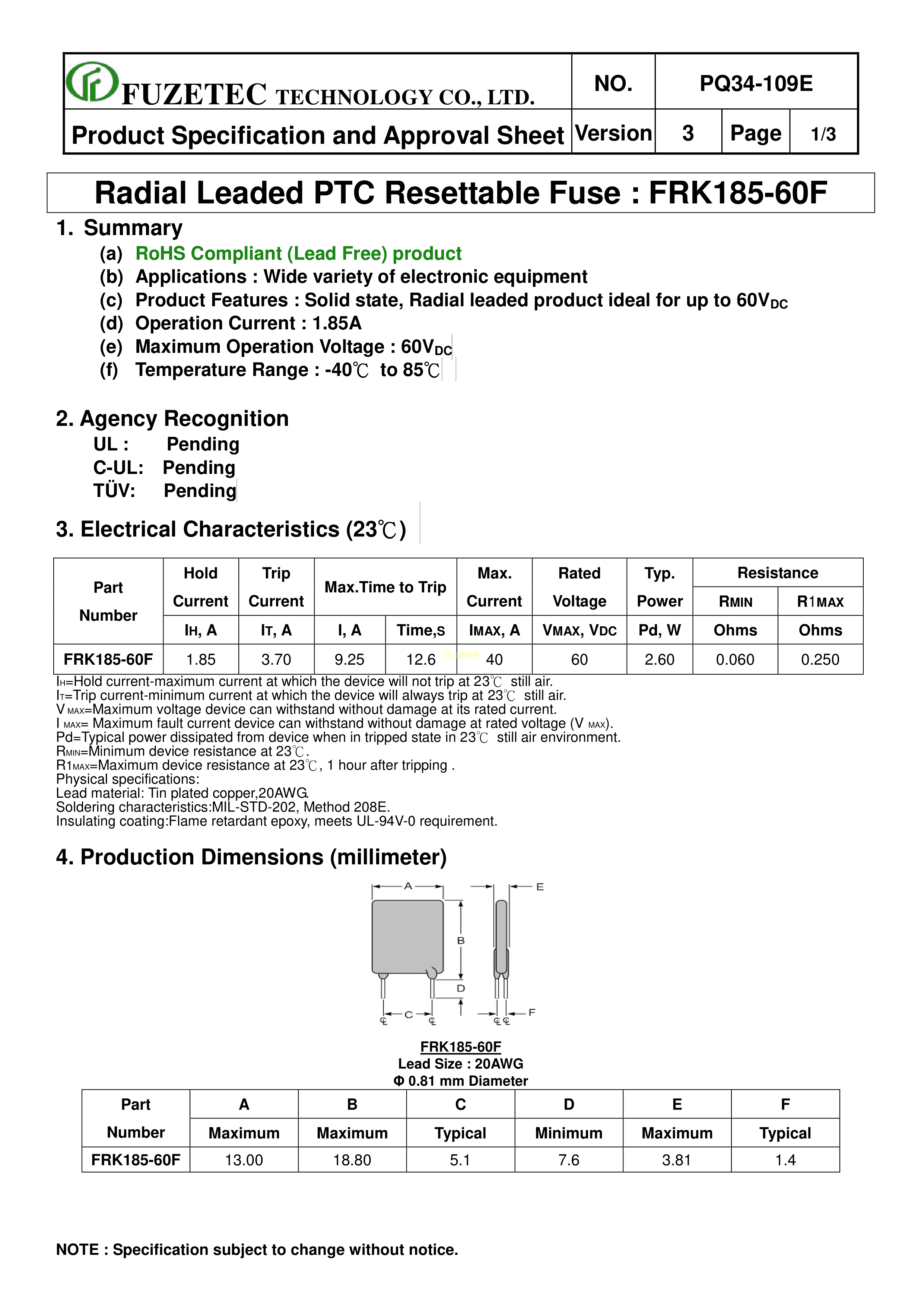 FRK185-60F数据手册径向引线封装FUZETEC(台湾富致)PDF规格书,中英文下载