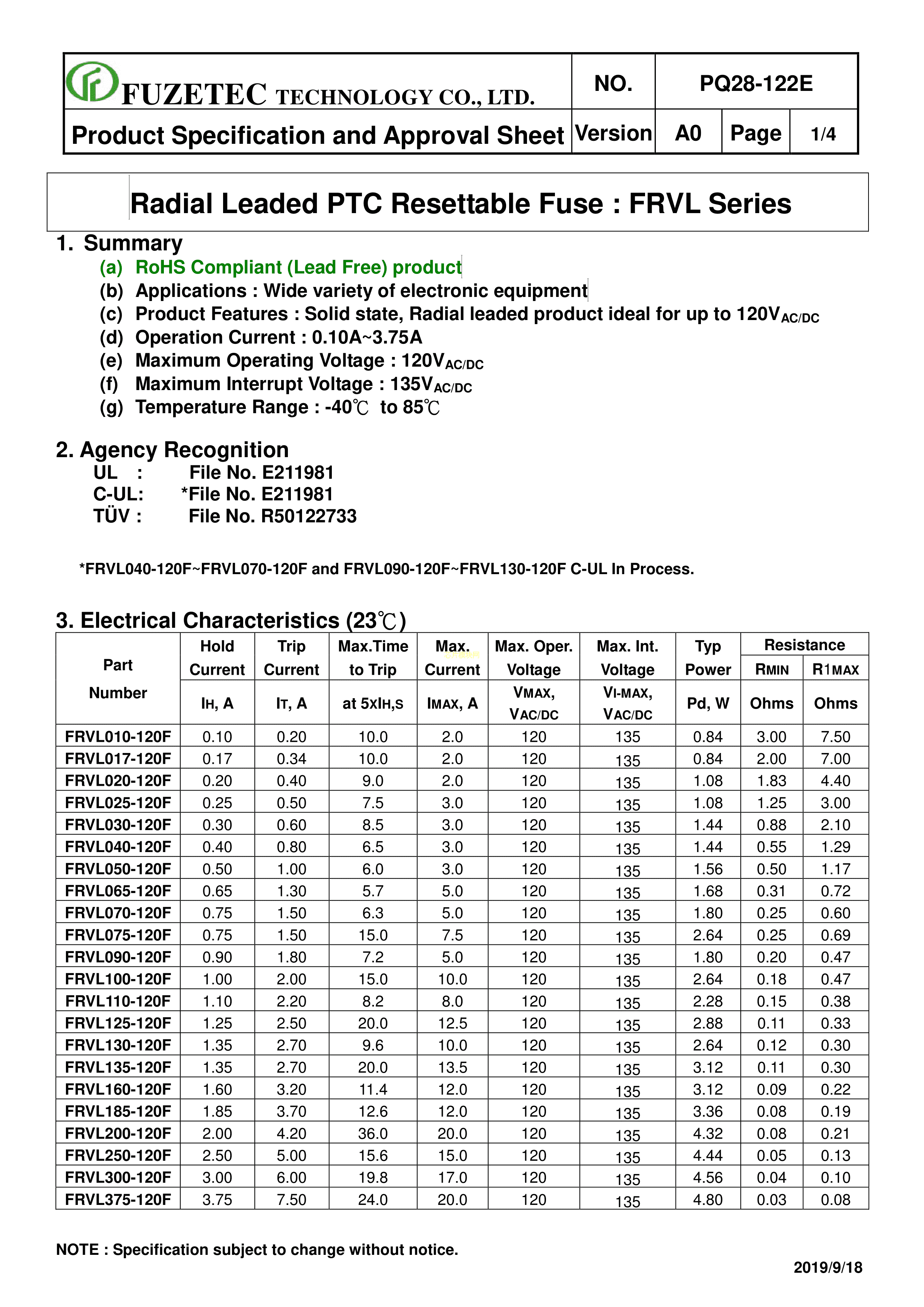 FRVL075-120F数据手册径向引线封装FUZETEC(台湾富致)PDF规格书,中英文下载