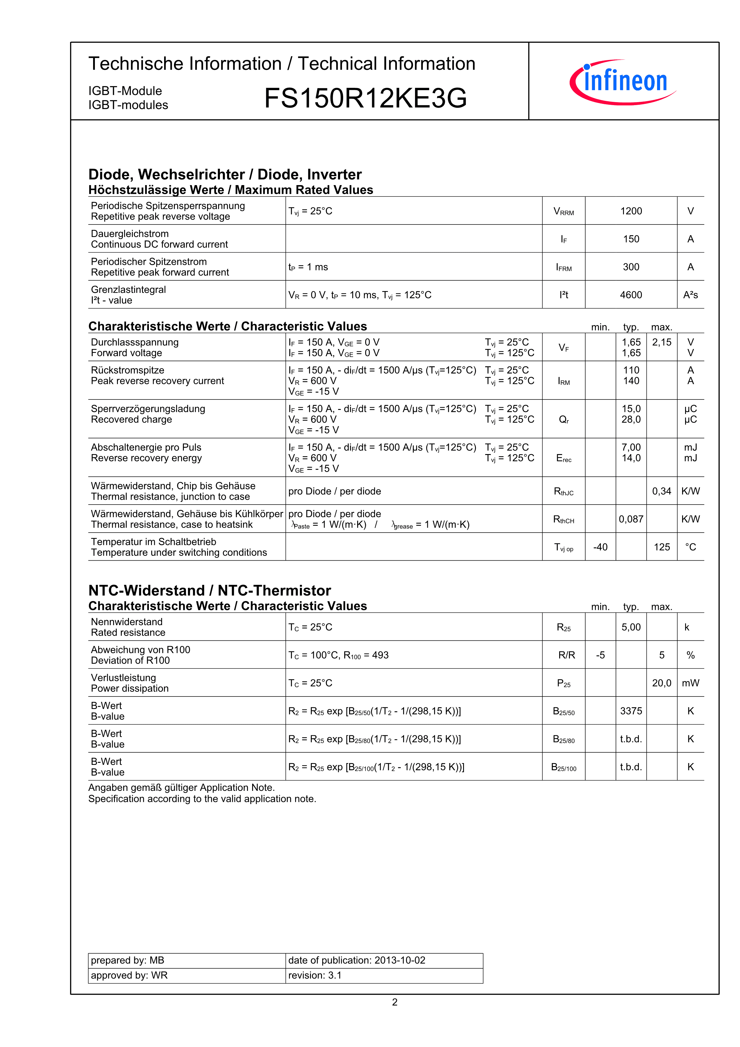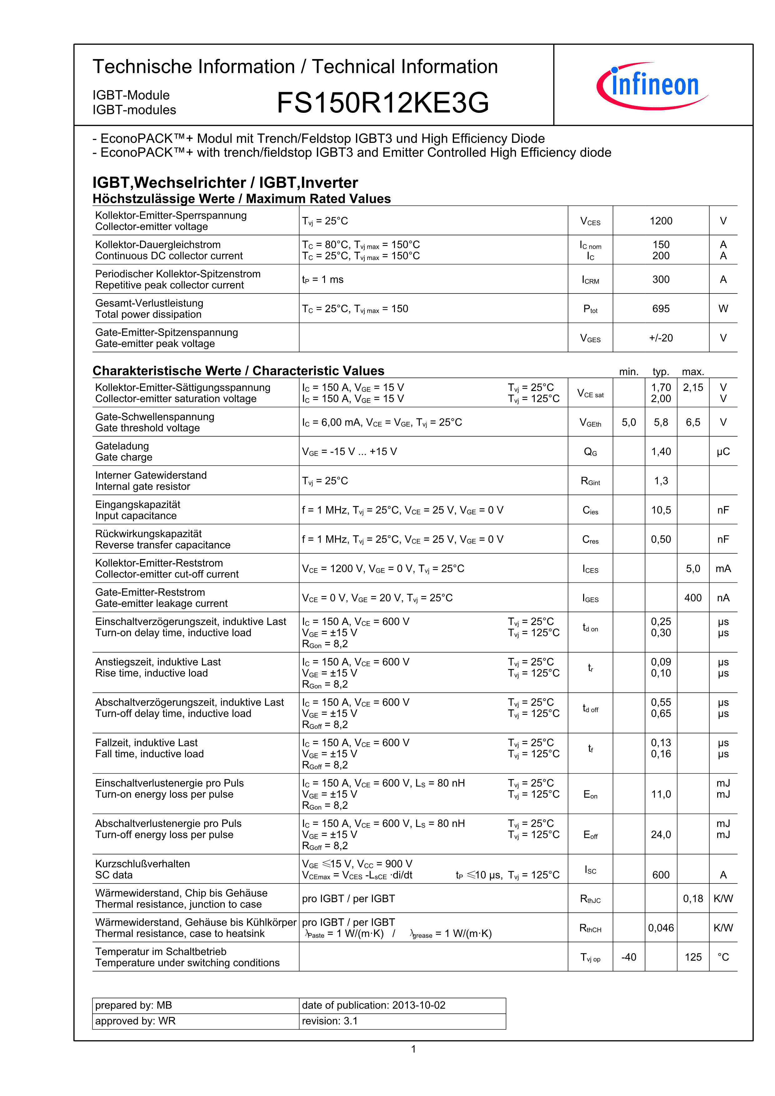 FS150R12KE3G数据手册AG-ECONOPP-1封装Infineon(英飞凌)PDF规格书,
