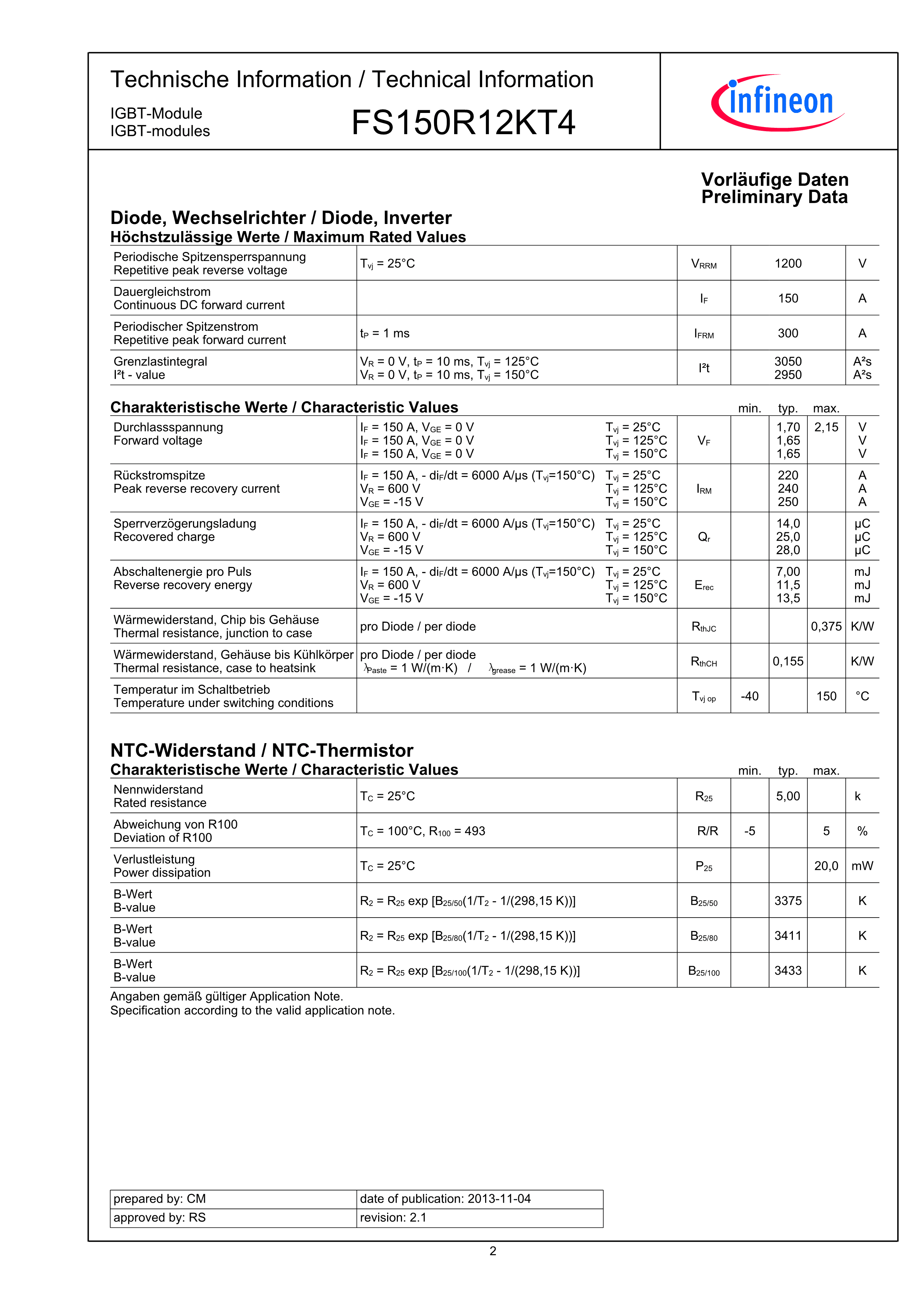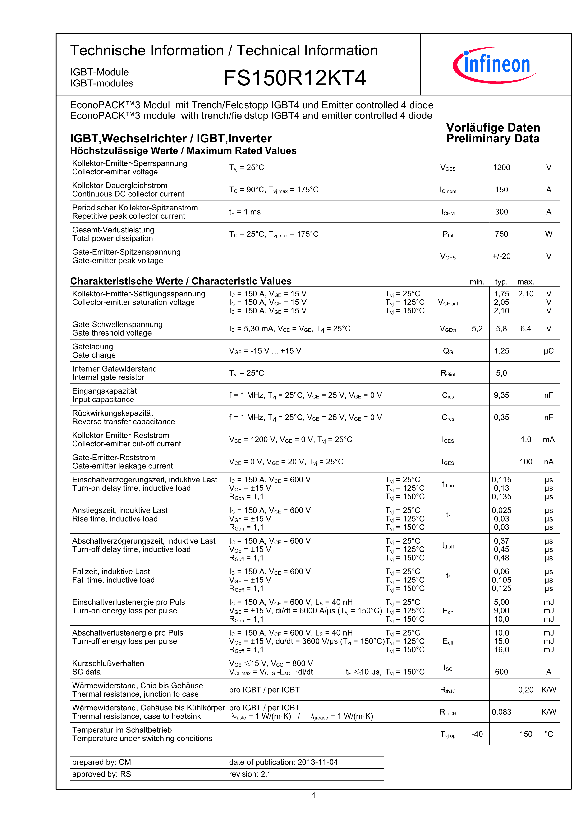 FS150R12KT4数据手册AG-ECONO3-4封装Infineon(英飞凌)PDF规格书,中英
