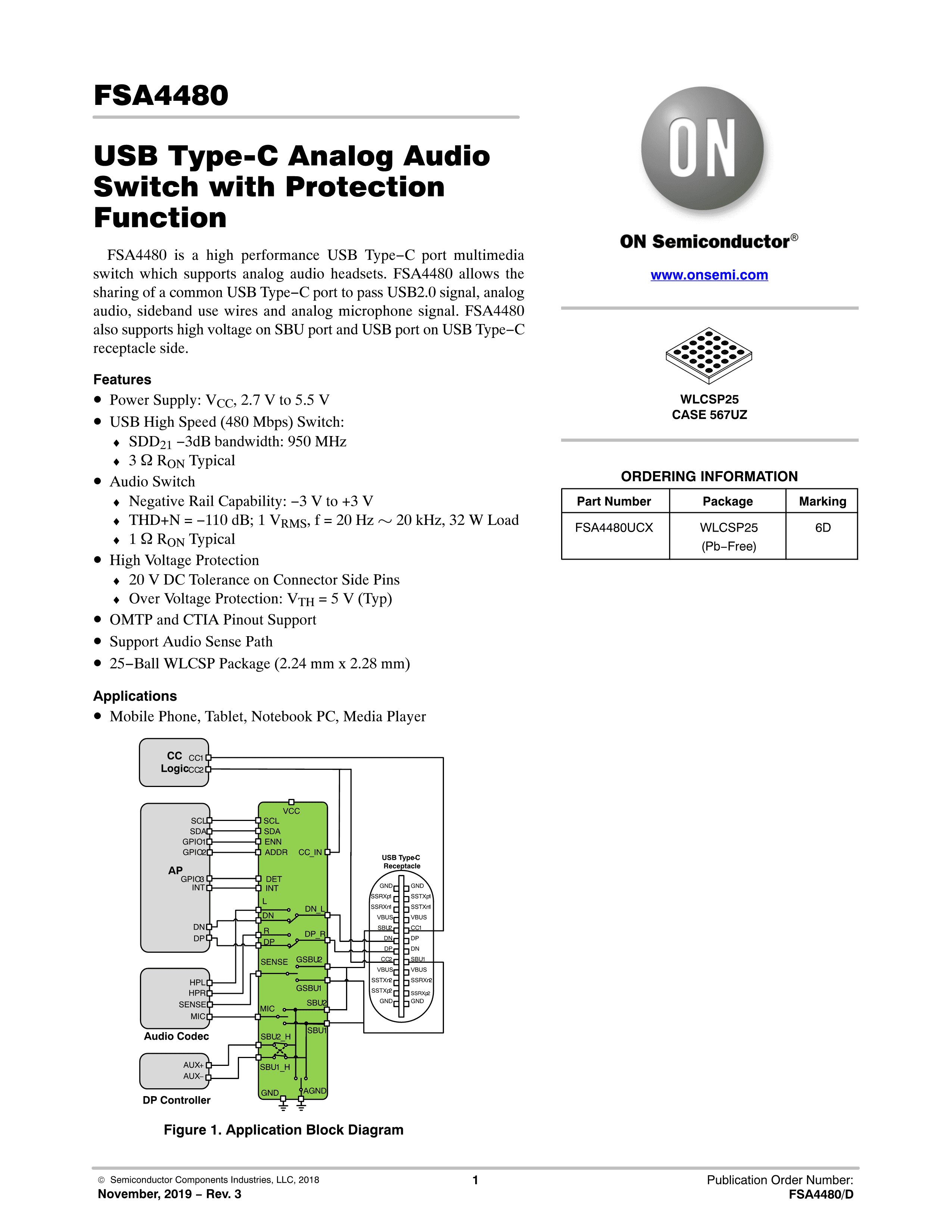 FSA4480UCX数据手册WLCSP-25封装onsemi(安森美)PDF规格书,中英文下载