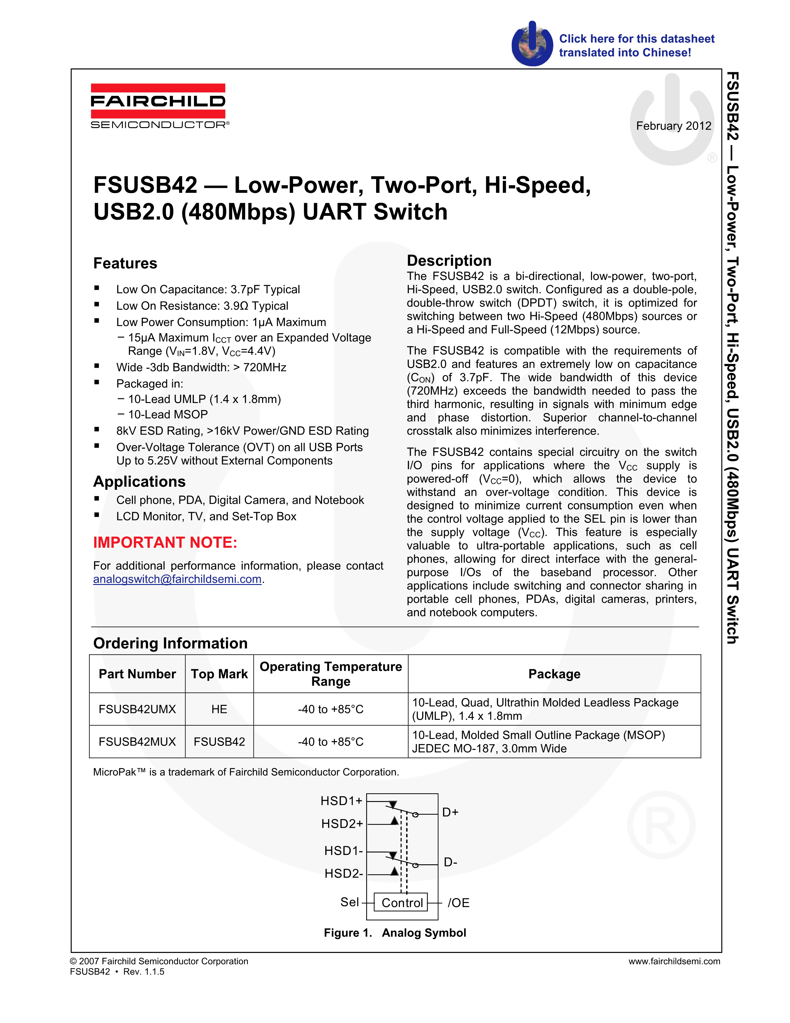 FSUSB42MUX数据手册MSOP-10封装onsemi(安森美)PDF规格书,中英文下载
