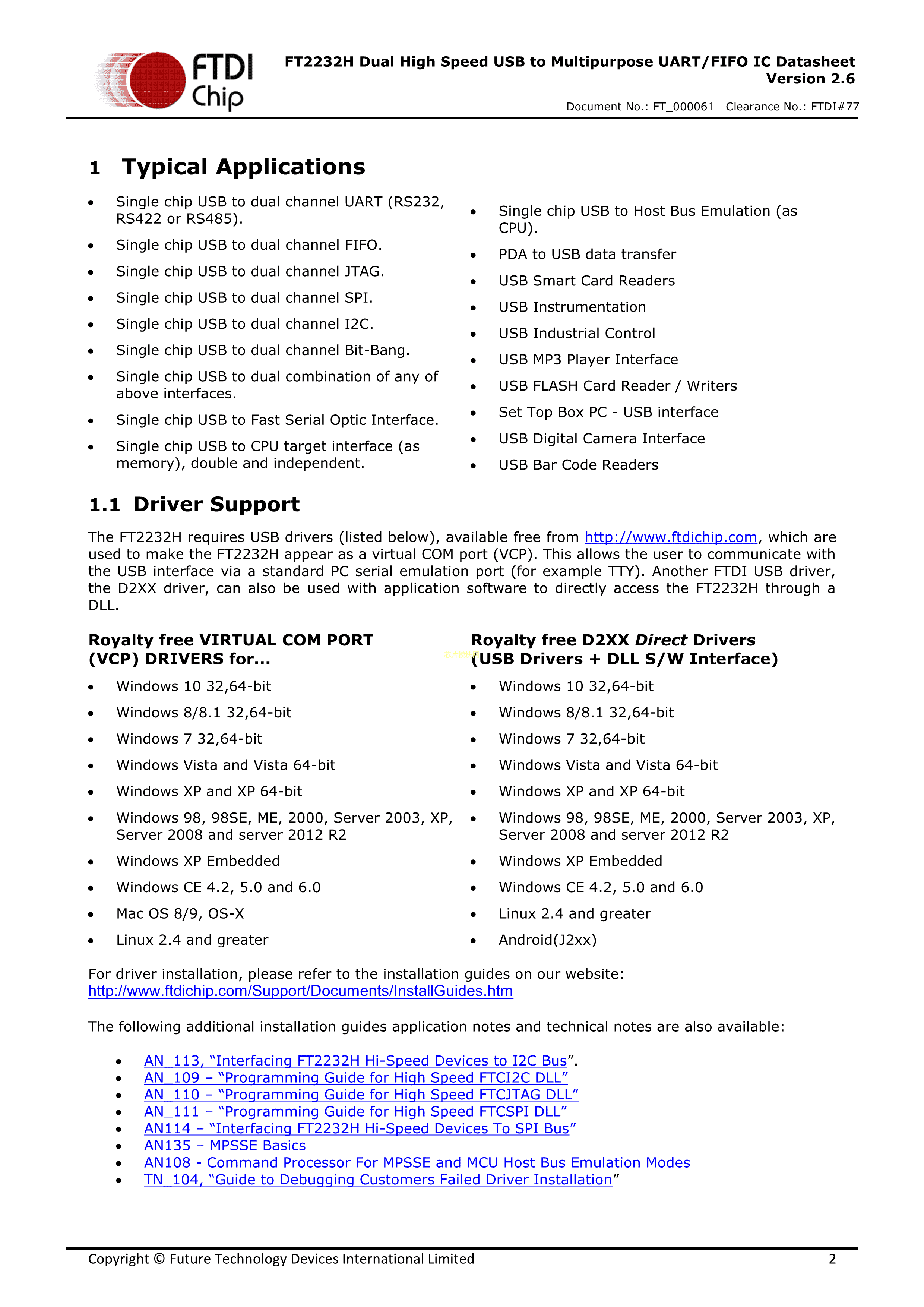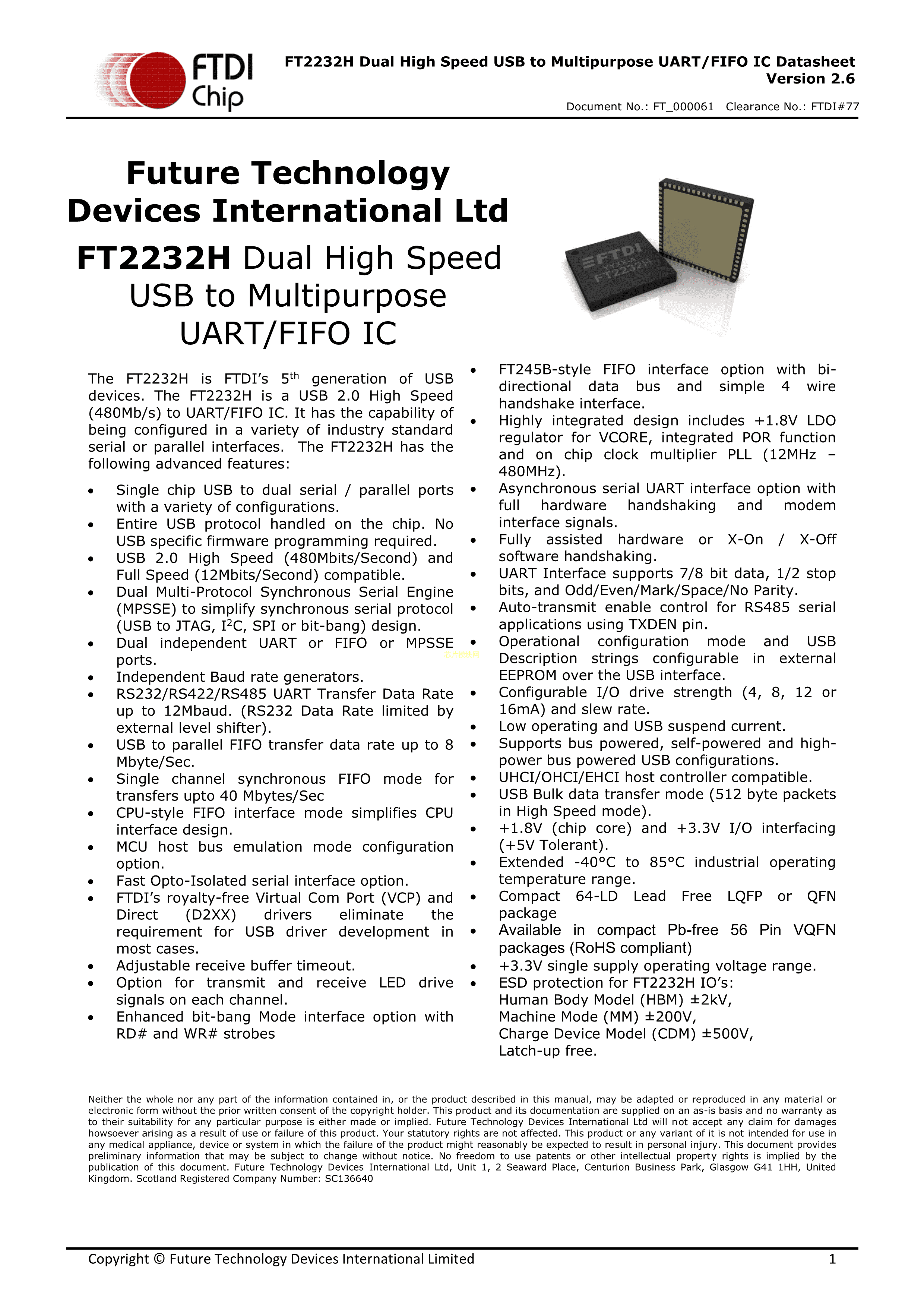FT2232H-56Q-TRAY数据手册VQFN-56(8x8)封装FTDI(飞特帝亚)PDF规格书