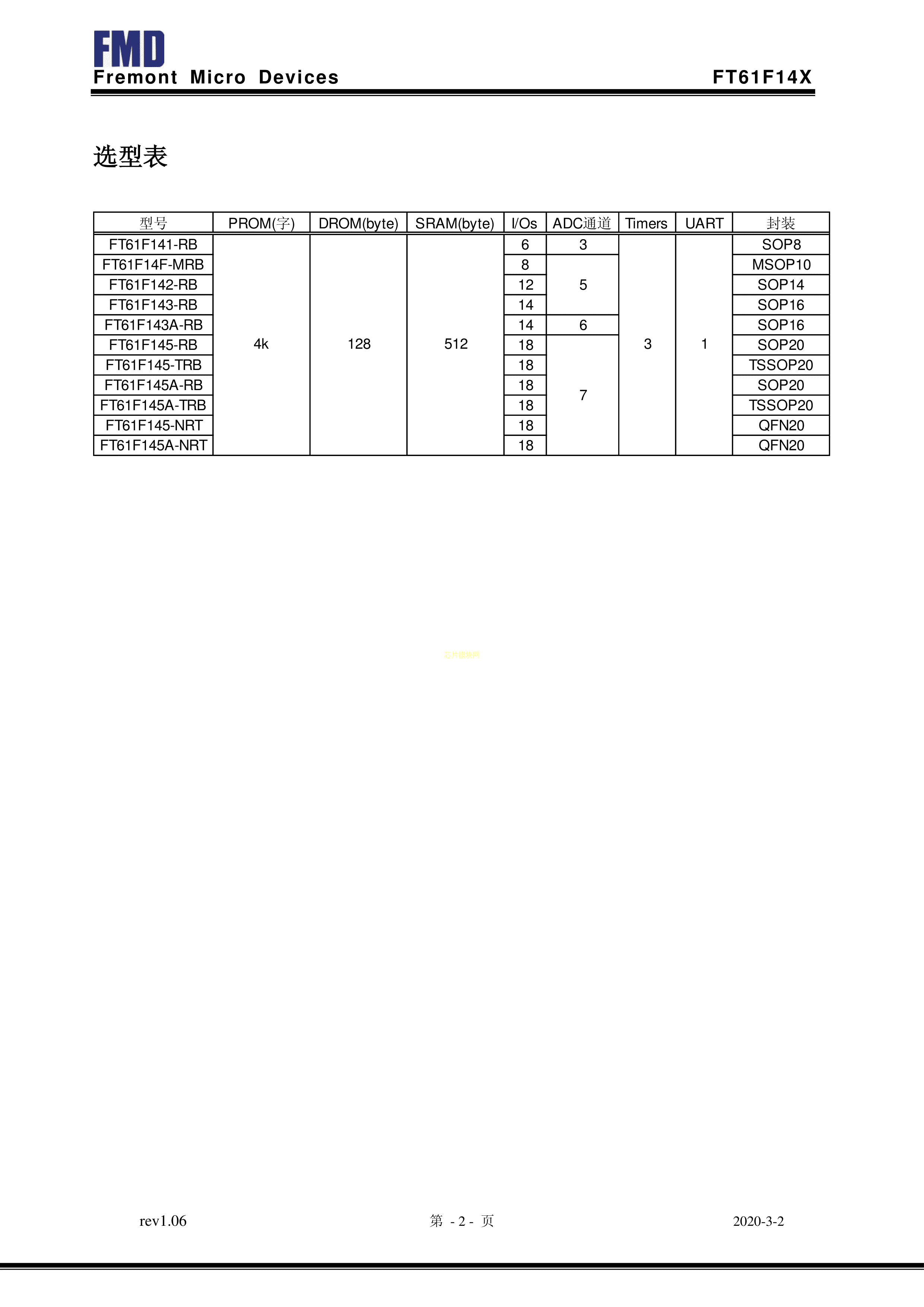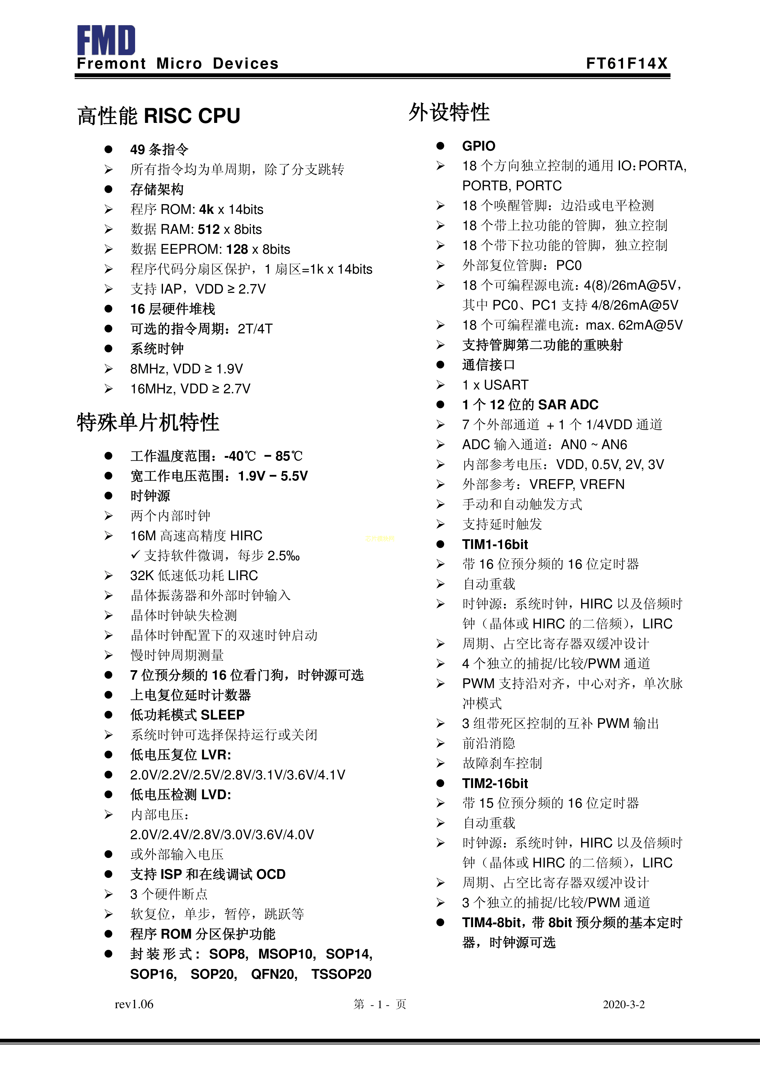 FT61F145A-RB数据手册SOP-20封装FMD(辉芒微)PDF规格书,中英文下载