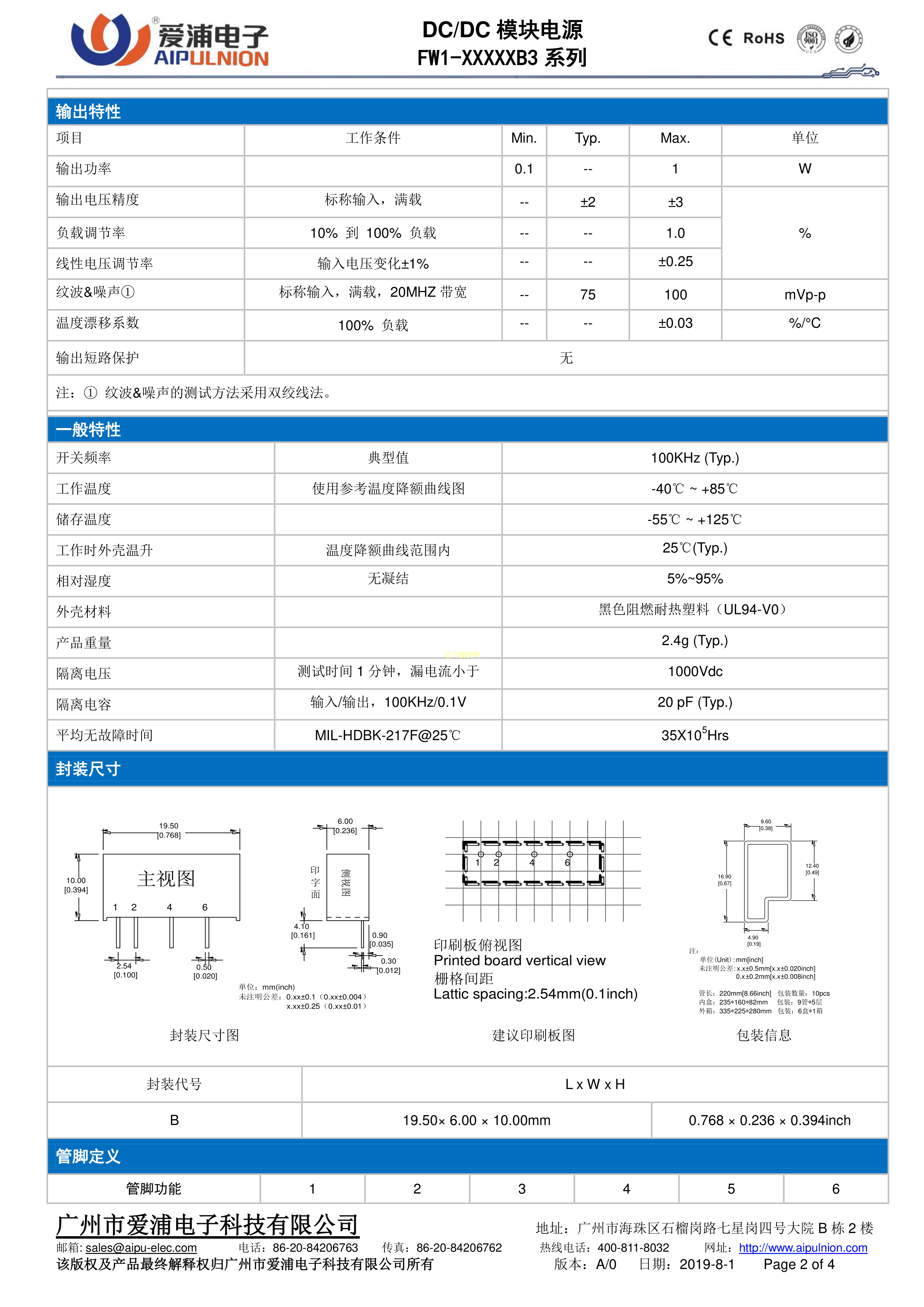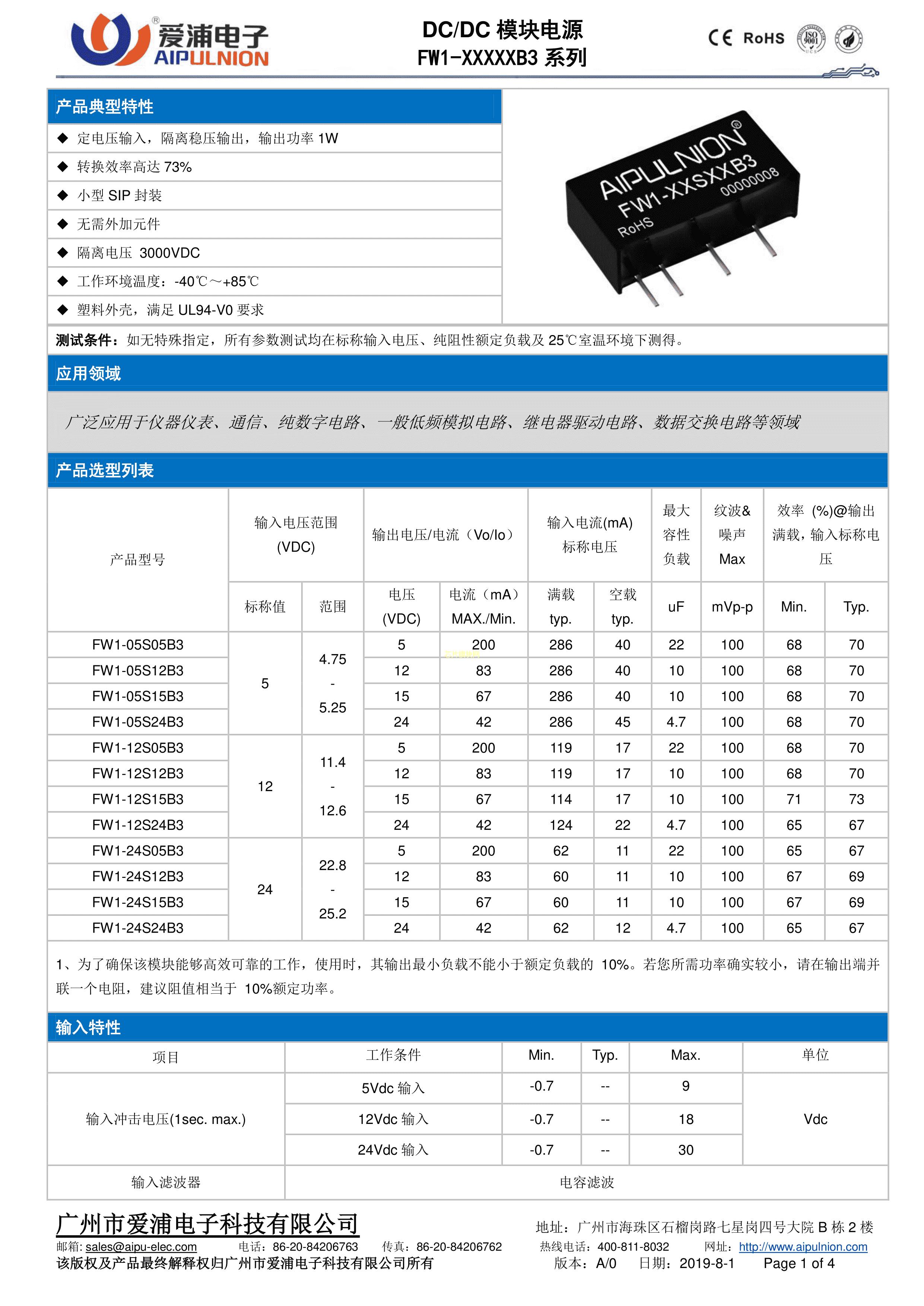 FW1-12S15B3数据手册插件封装AIPULNION(爱浦电子)PDF规格书,中英文下载
