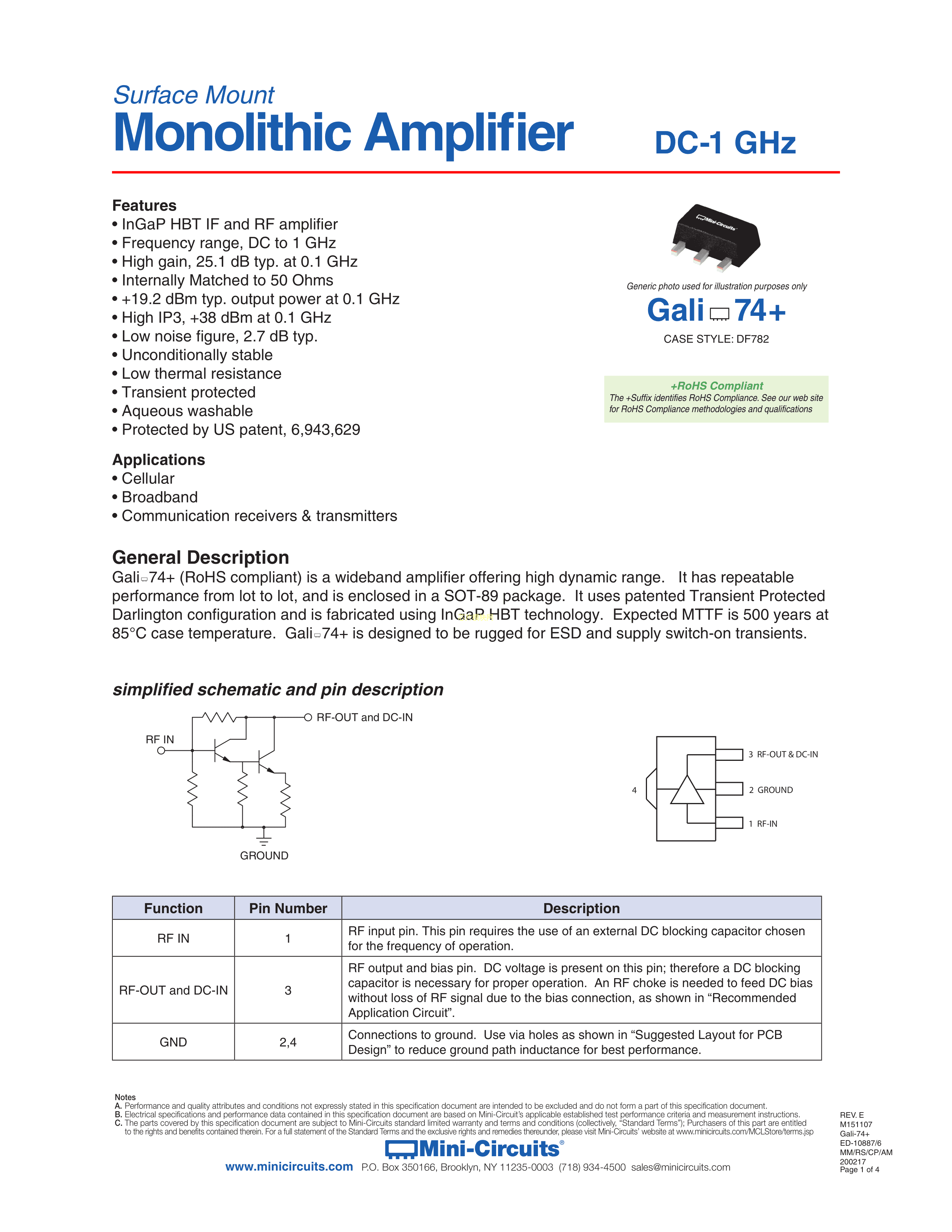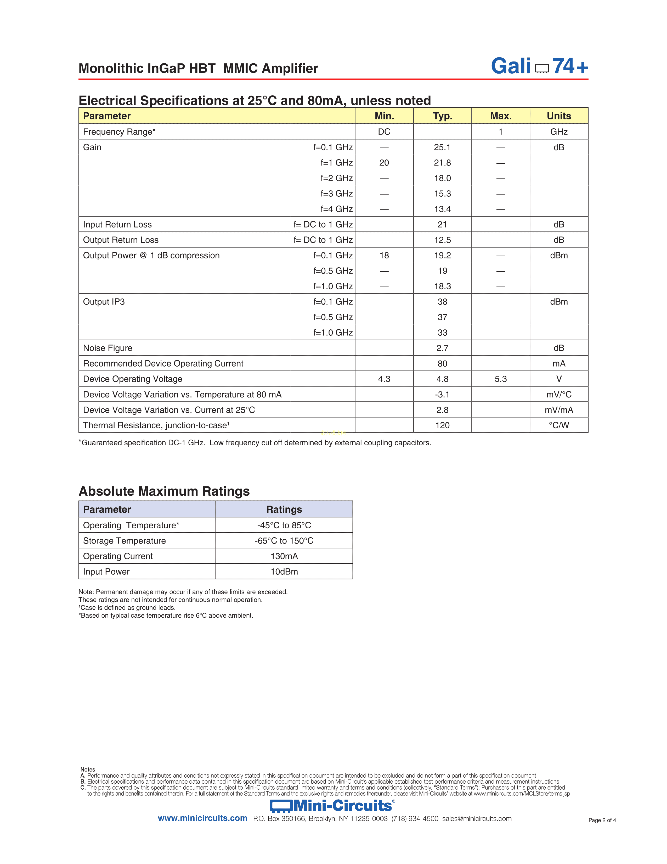 GALI-74+数据手册SOT-89封装Mini-CircuitsPDF规格书,中英文下载