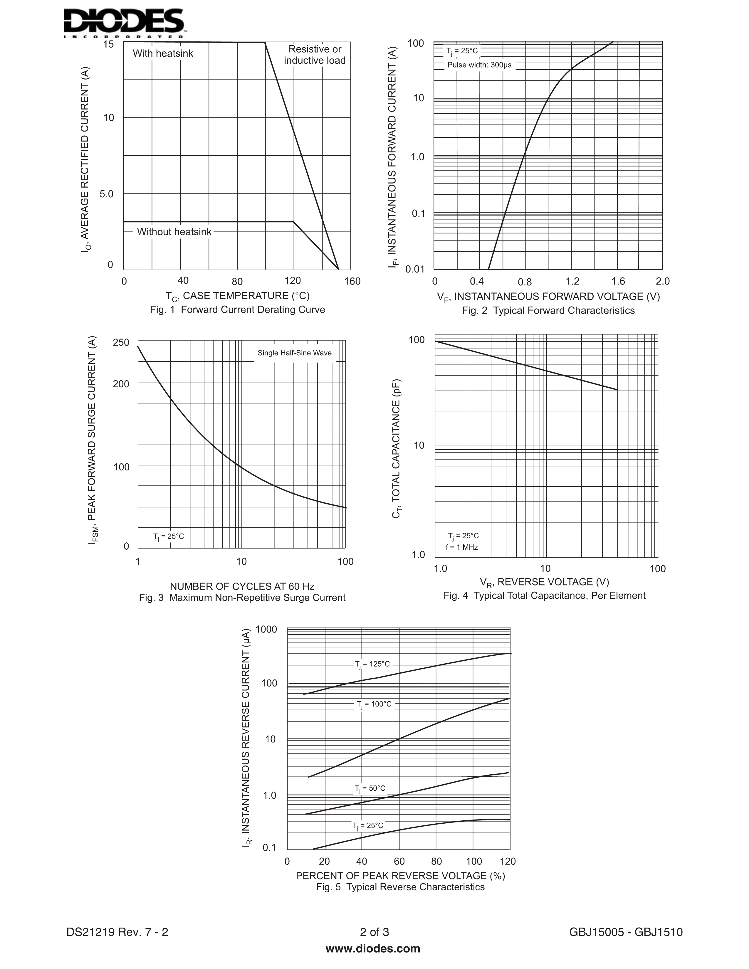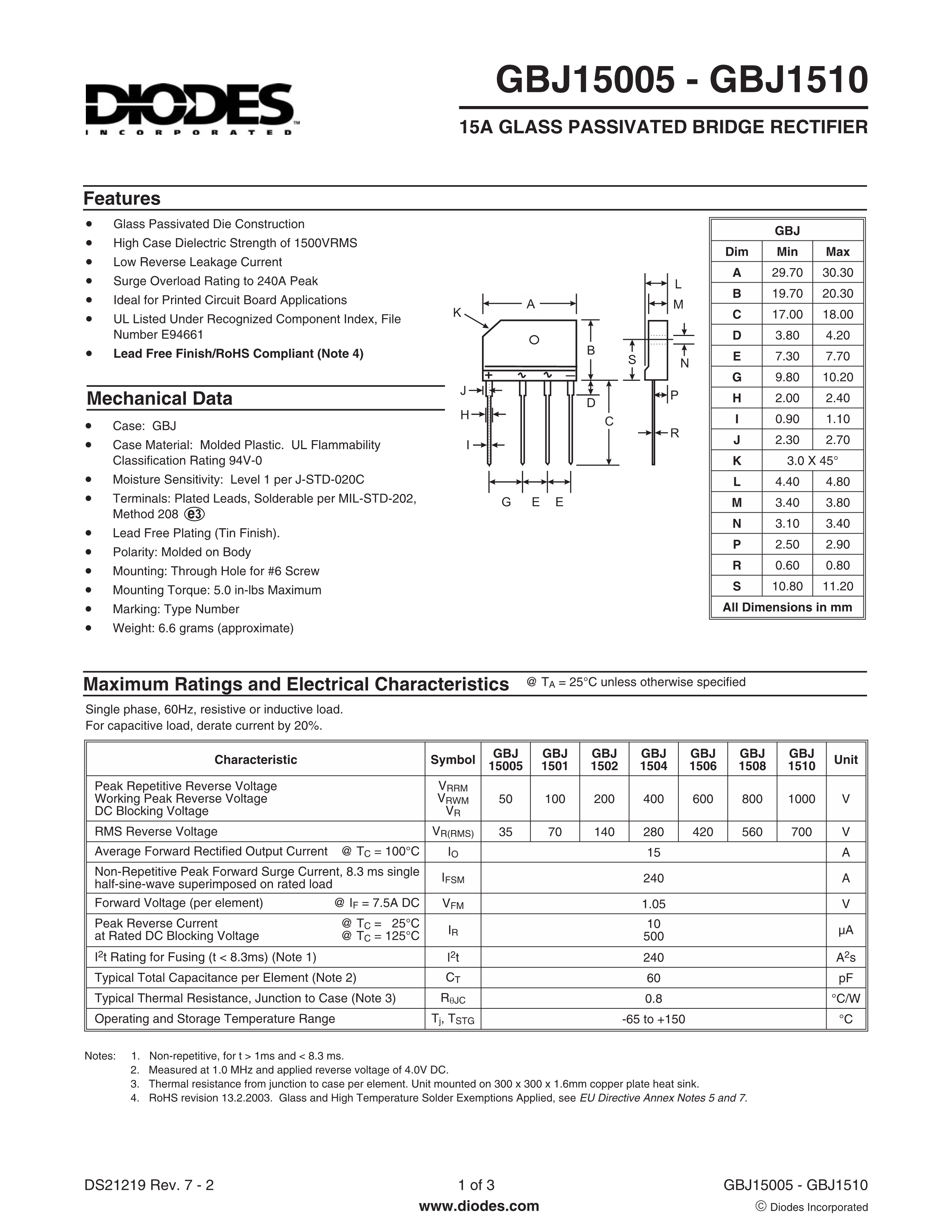 GBJ1502-F数据手册GBJ封装DIODES(美台)PDF规格书,中英文下载