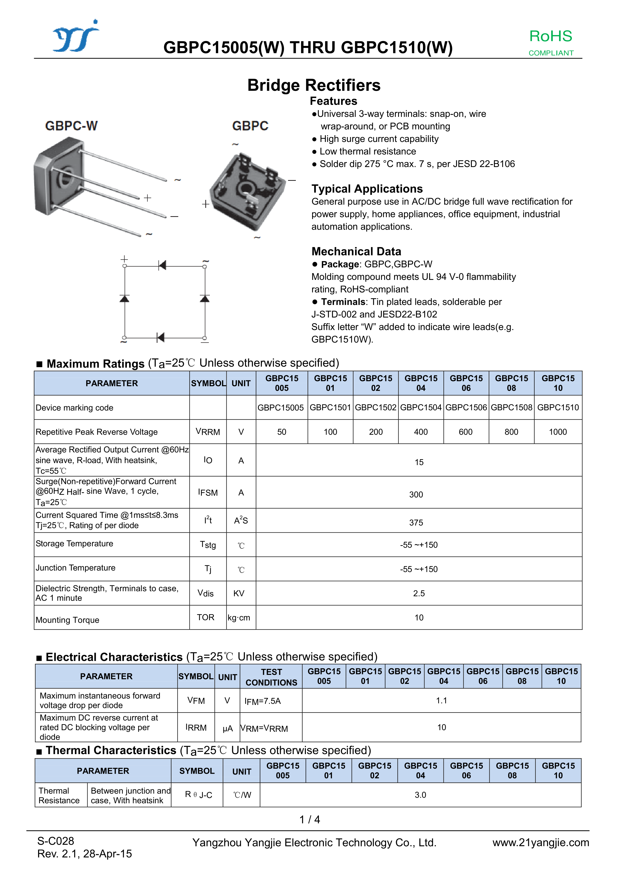 GBPC1510数据手册GBPC封装YANGJIE(扬杰)PDF规格书,中英文下载
