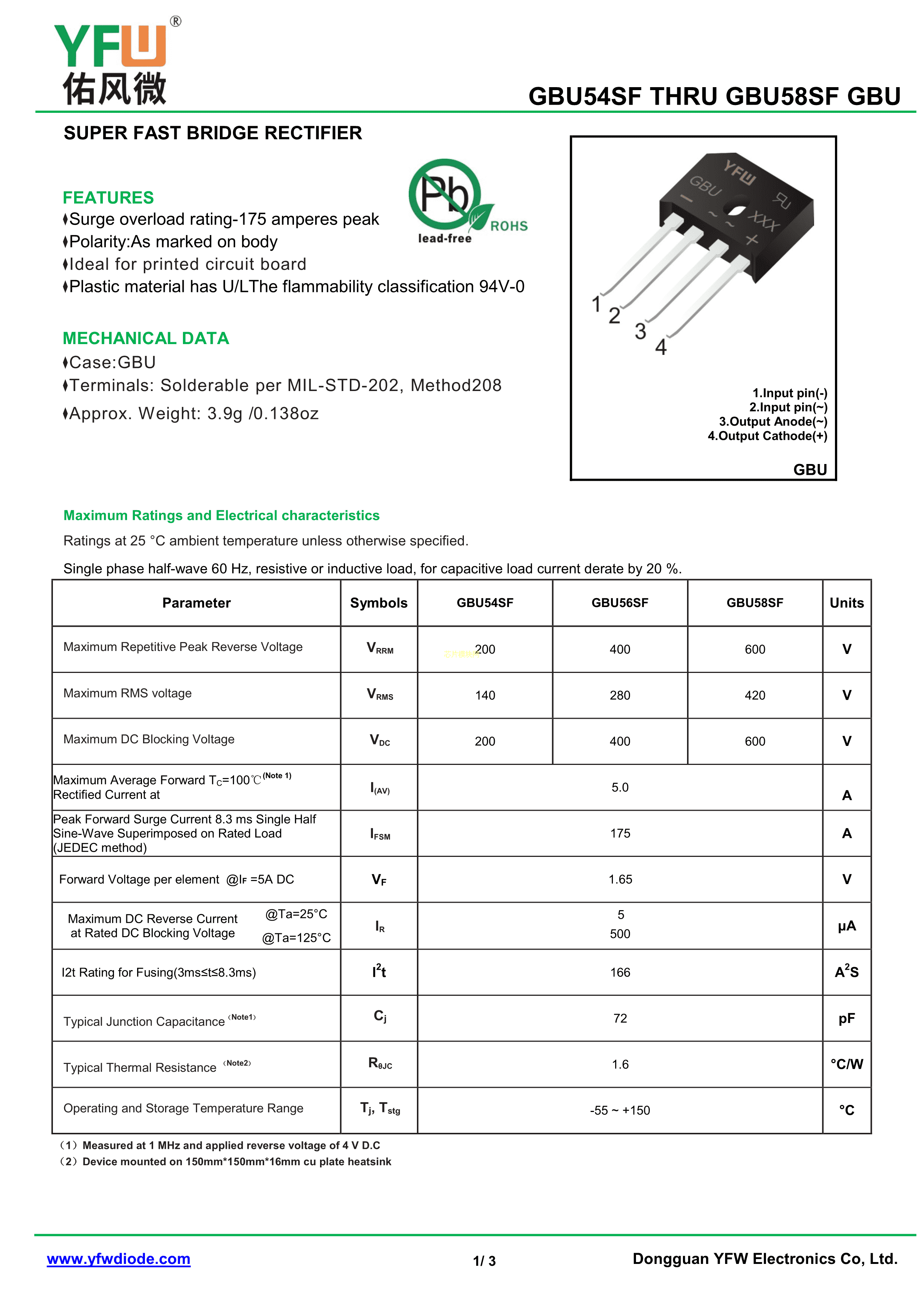 GBU58SF数据手册GBU封装YFW(佑风微)PDF规格书,中英文下载
