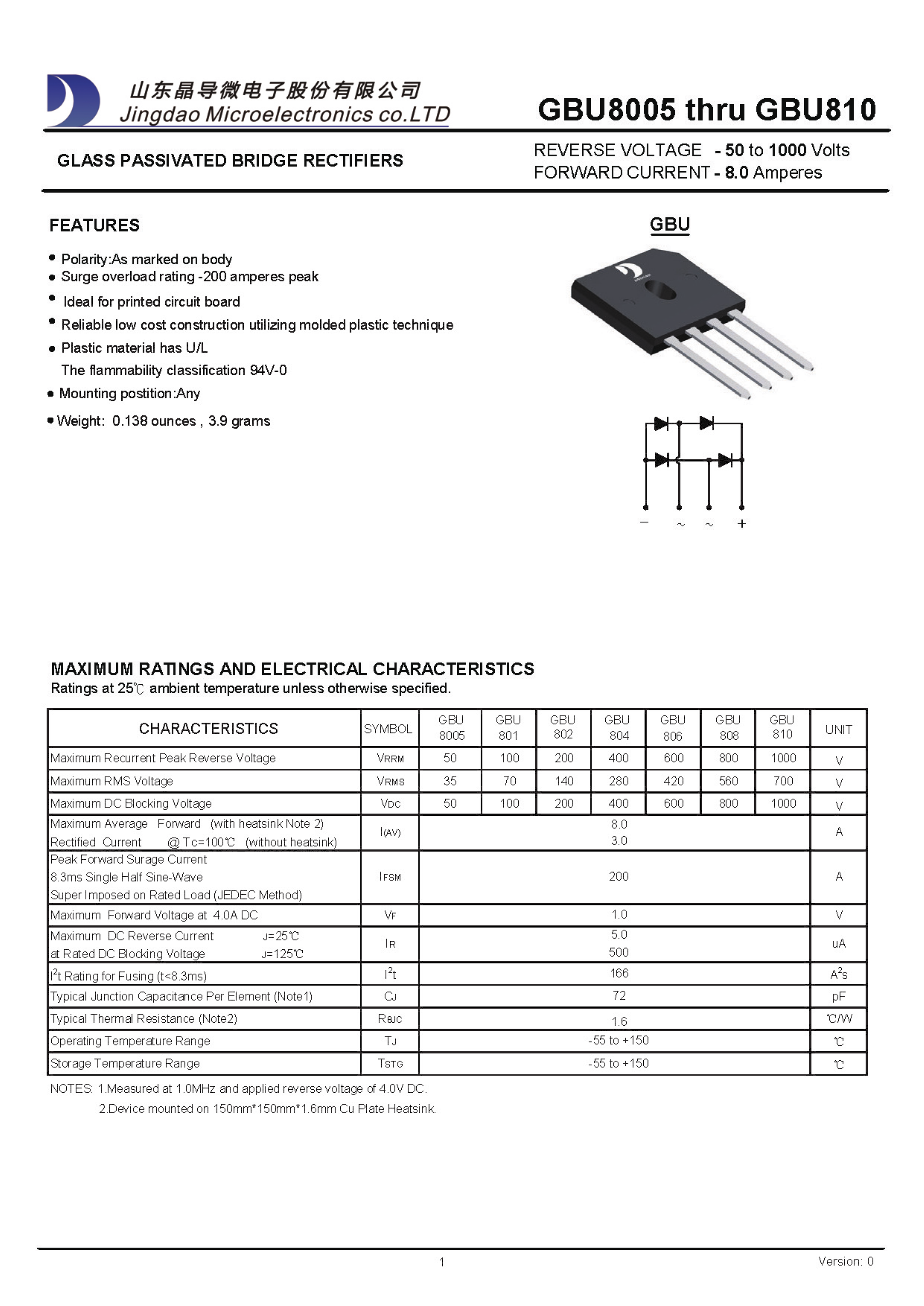 GBU801数据手册GBU封装晶导微电子PDF规格书,中英文下载
