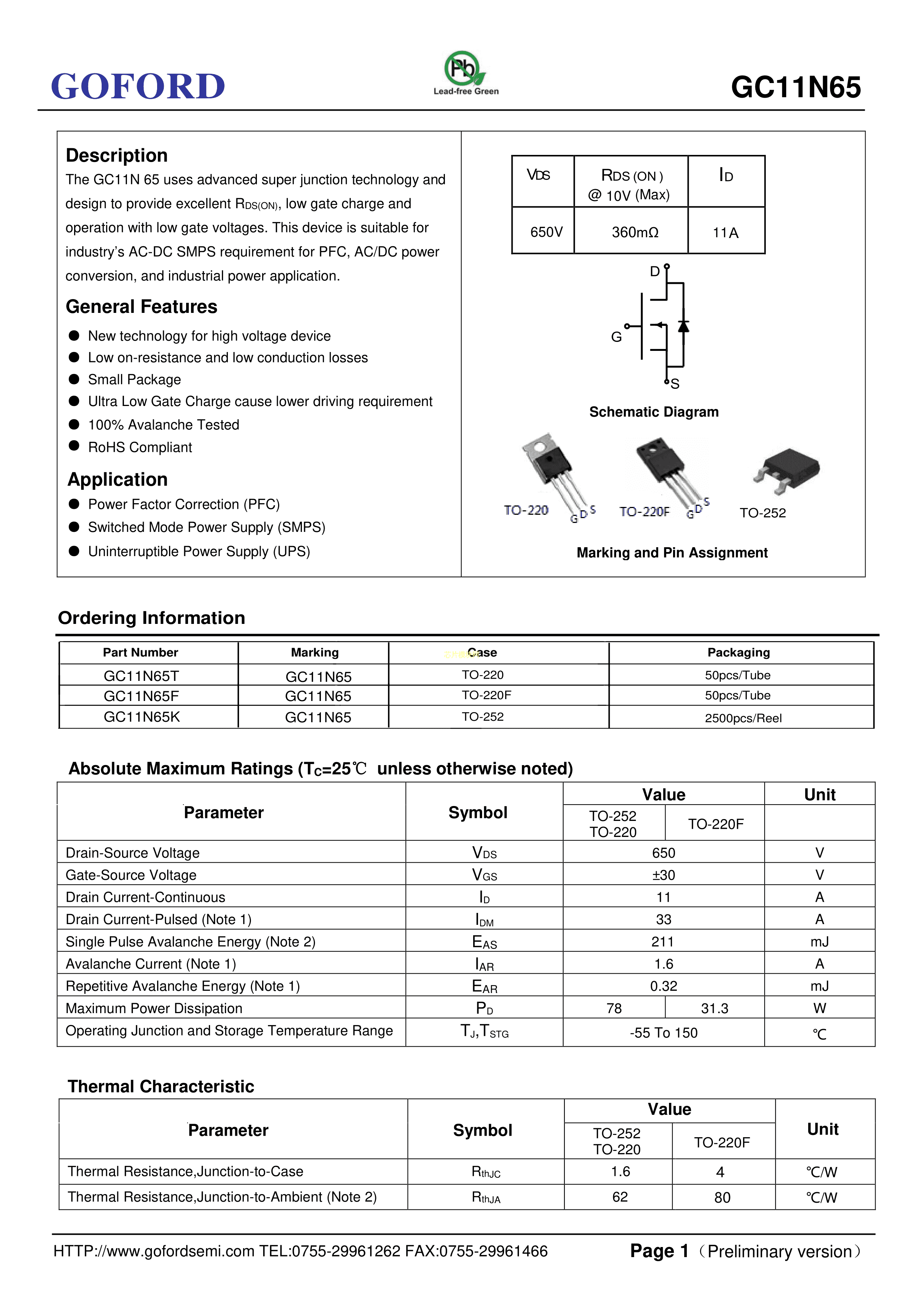 GC11N65F数据手册TO-220F封装GOFORD(谷峰)PDF规格书,中英文下载