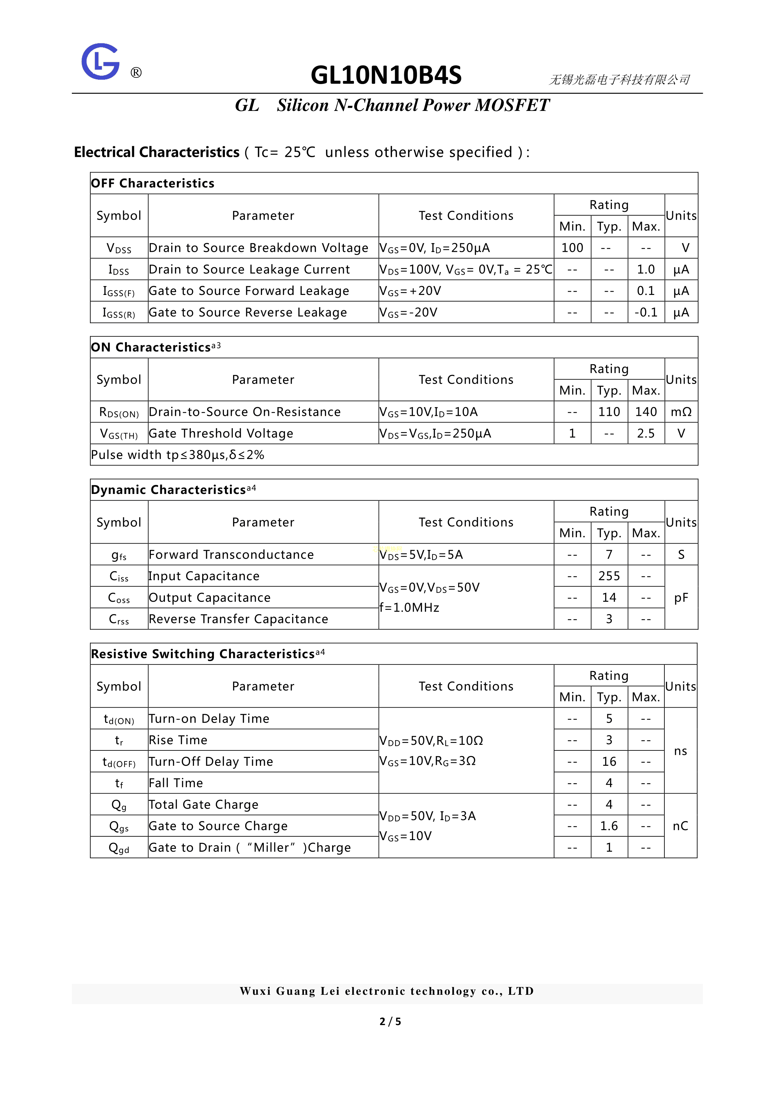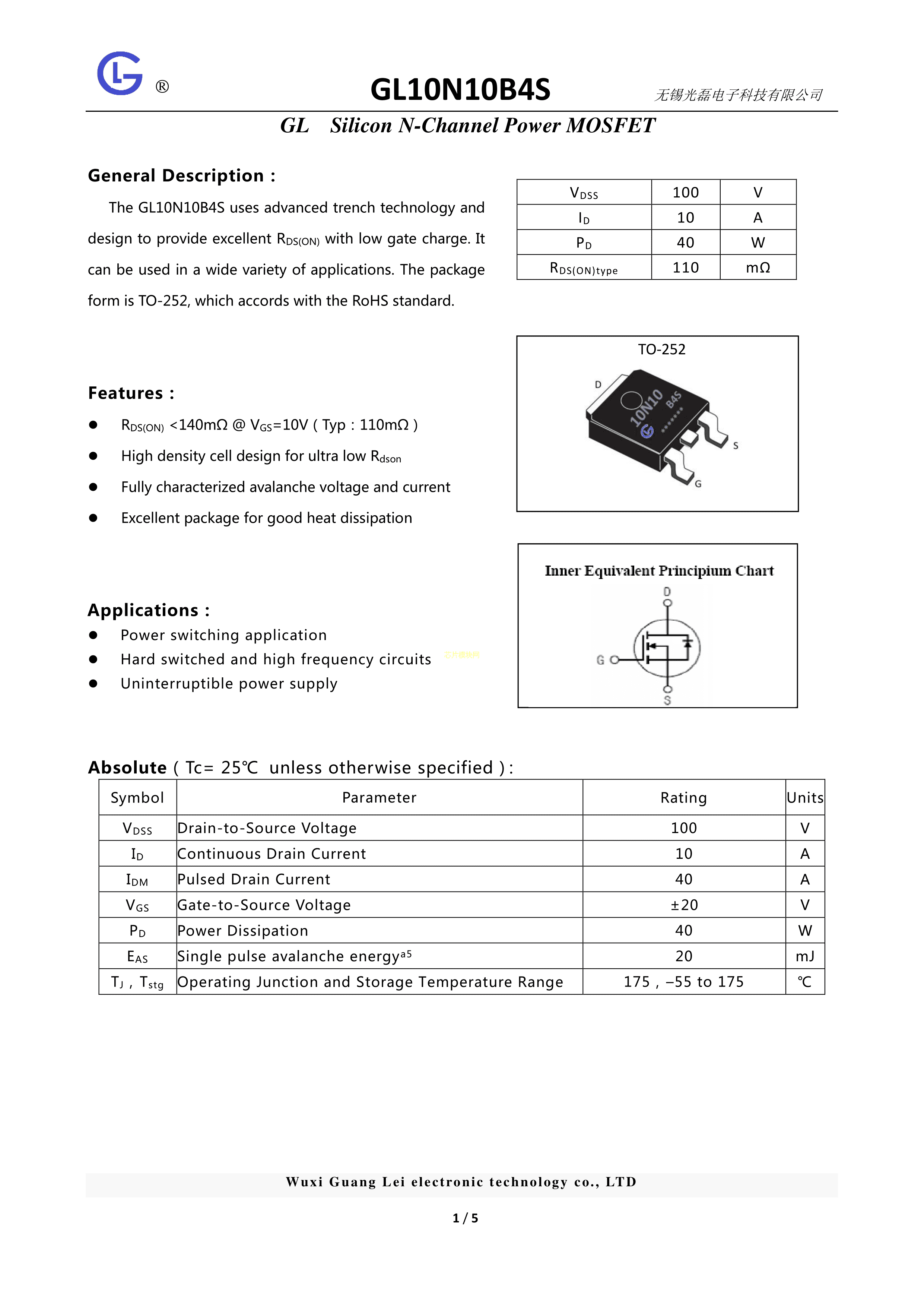 GL10N10B4S数据手册TO-252封装GL(光磊)PDF规格书,中英文下载
