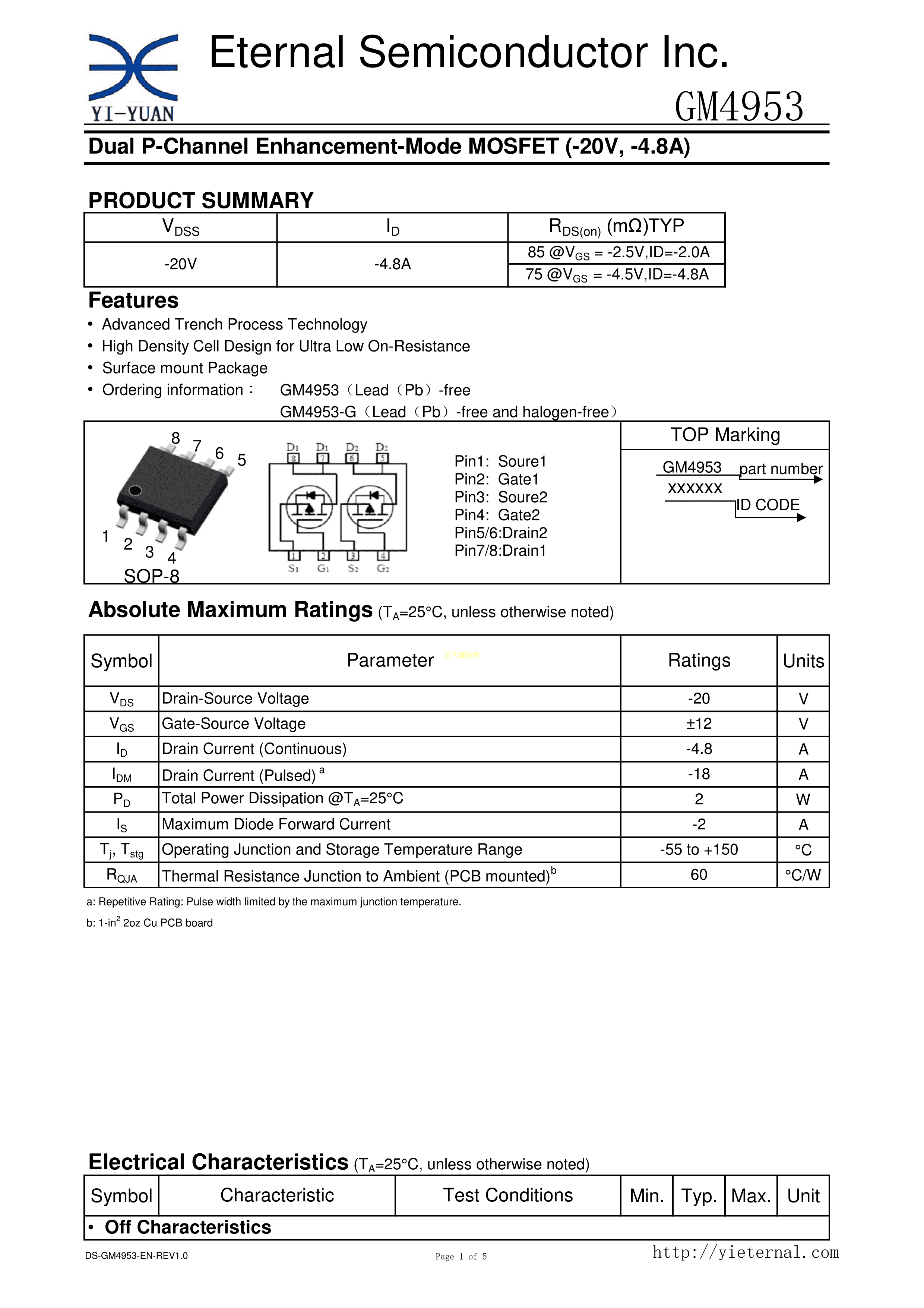 GM4953数据手册SOP-8封装宜源科技(ETERNAL)PDF规格书,中英文下载