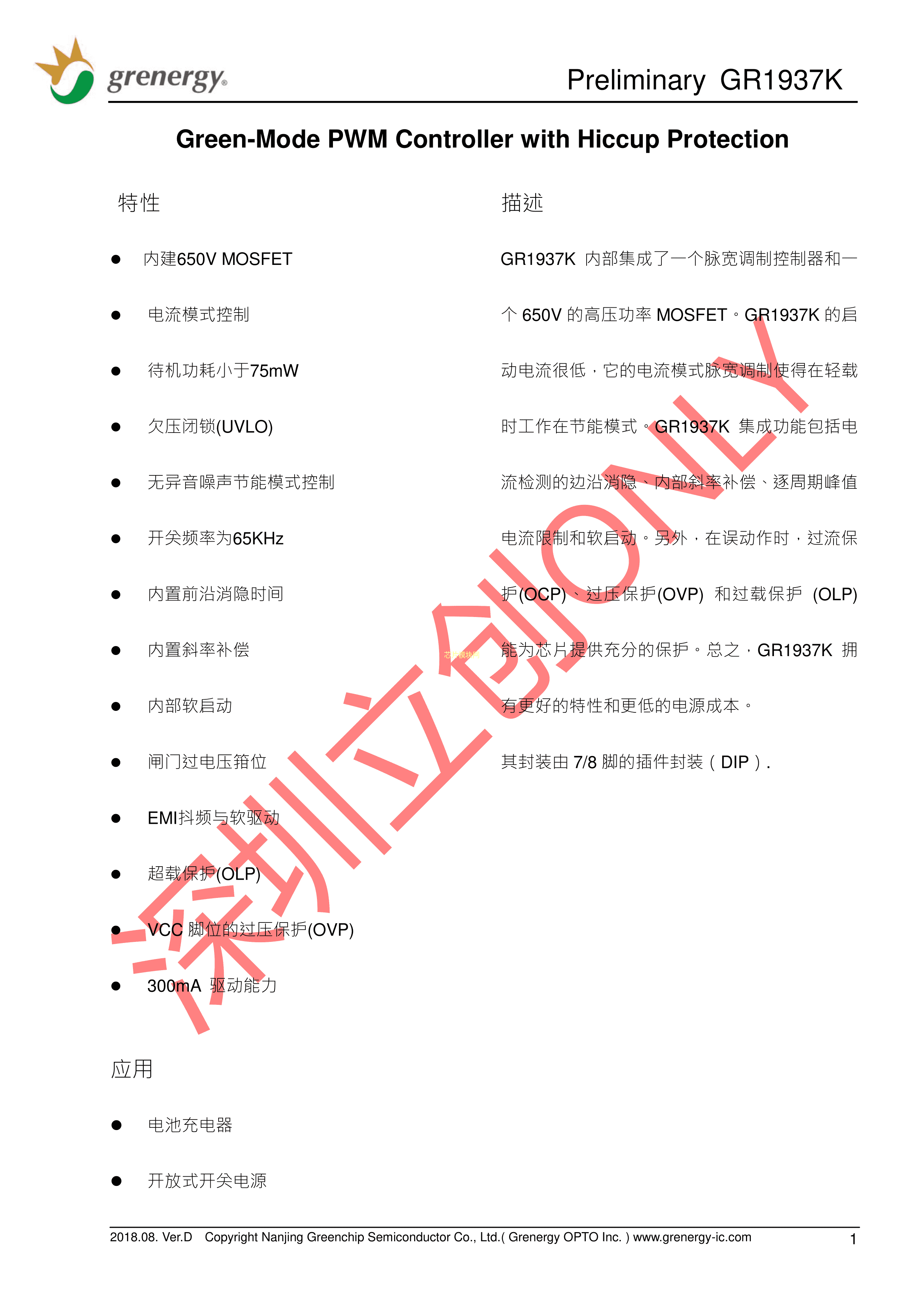 GR1937KJAG数据手册DIP-7封装Grenergy(南京绿芯)PDF规格书,中英文下载