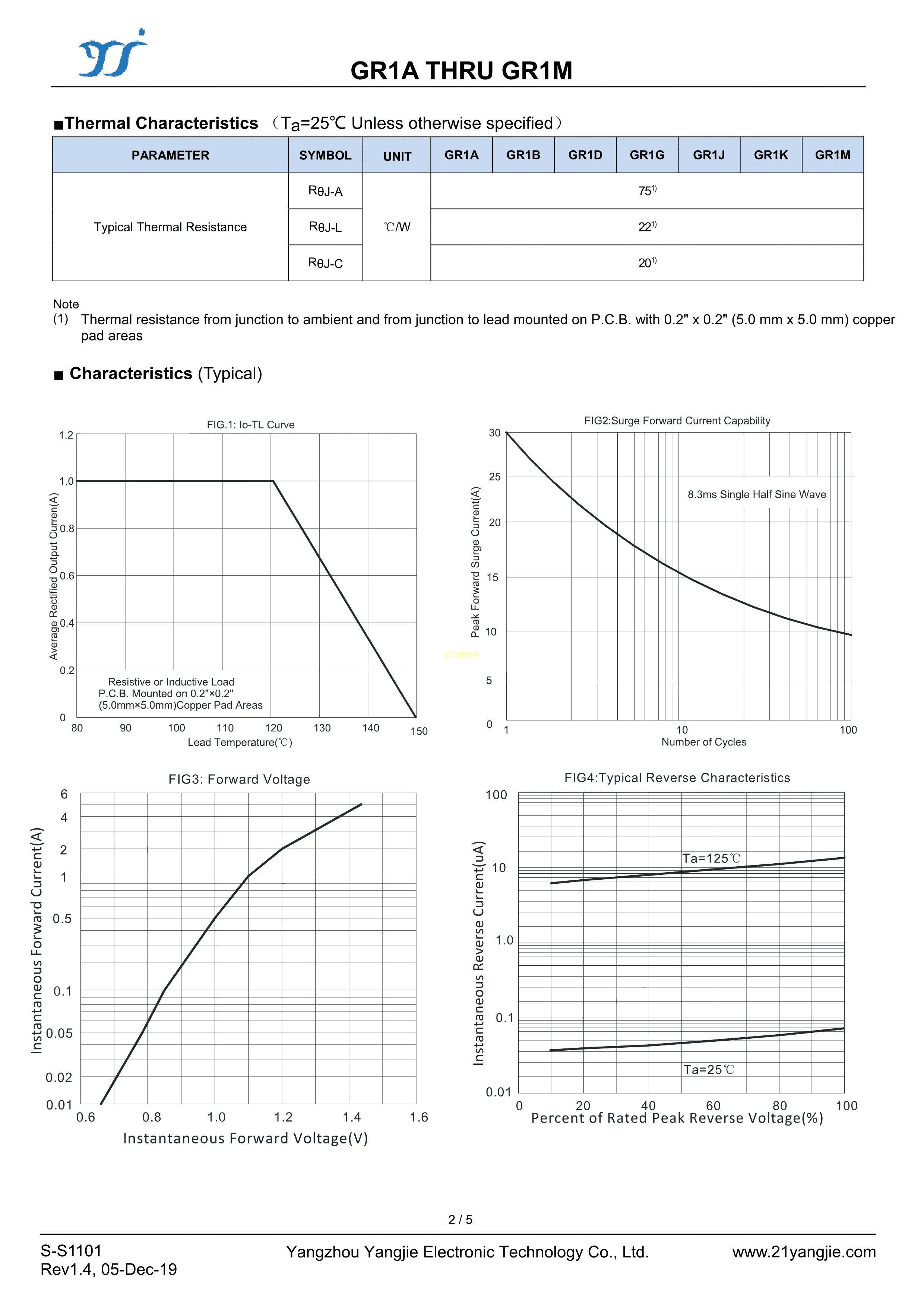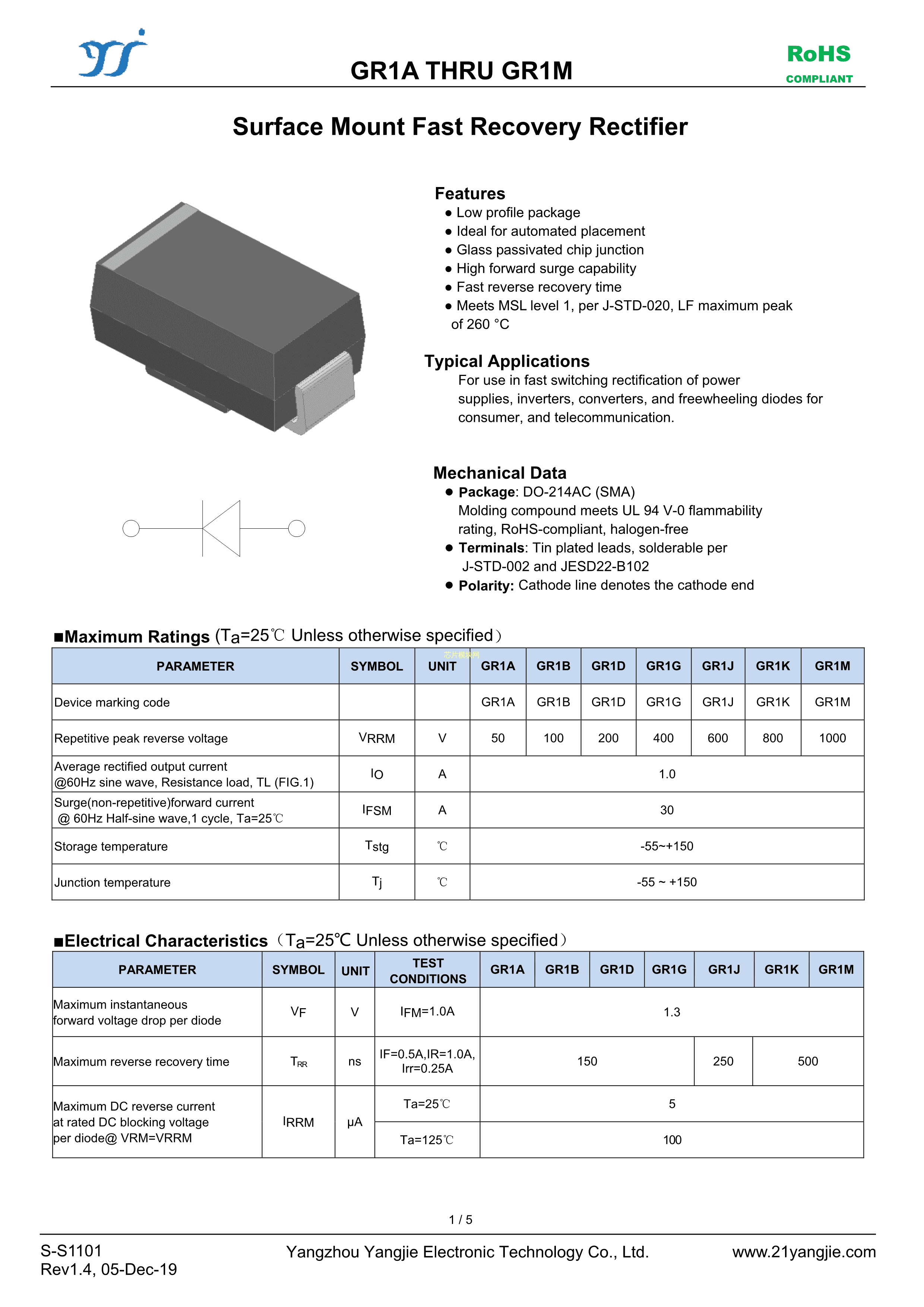 GR1J数据手册SMA封装YANGJIE(扬杰)PDF规格书,中英文下载