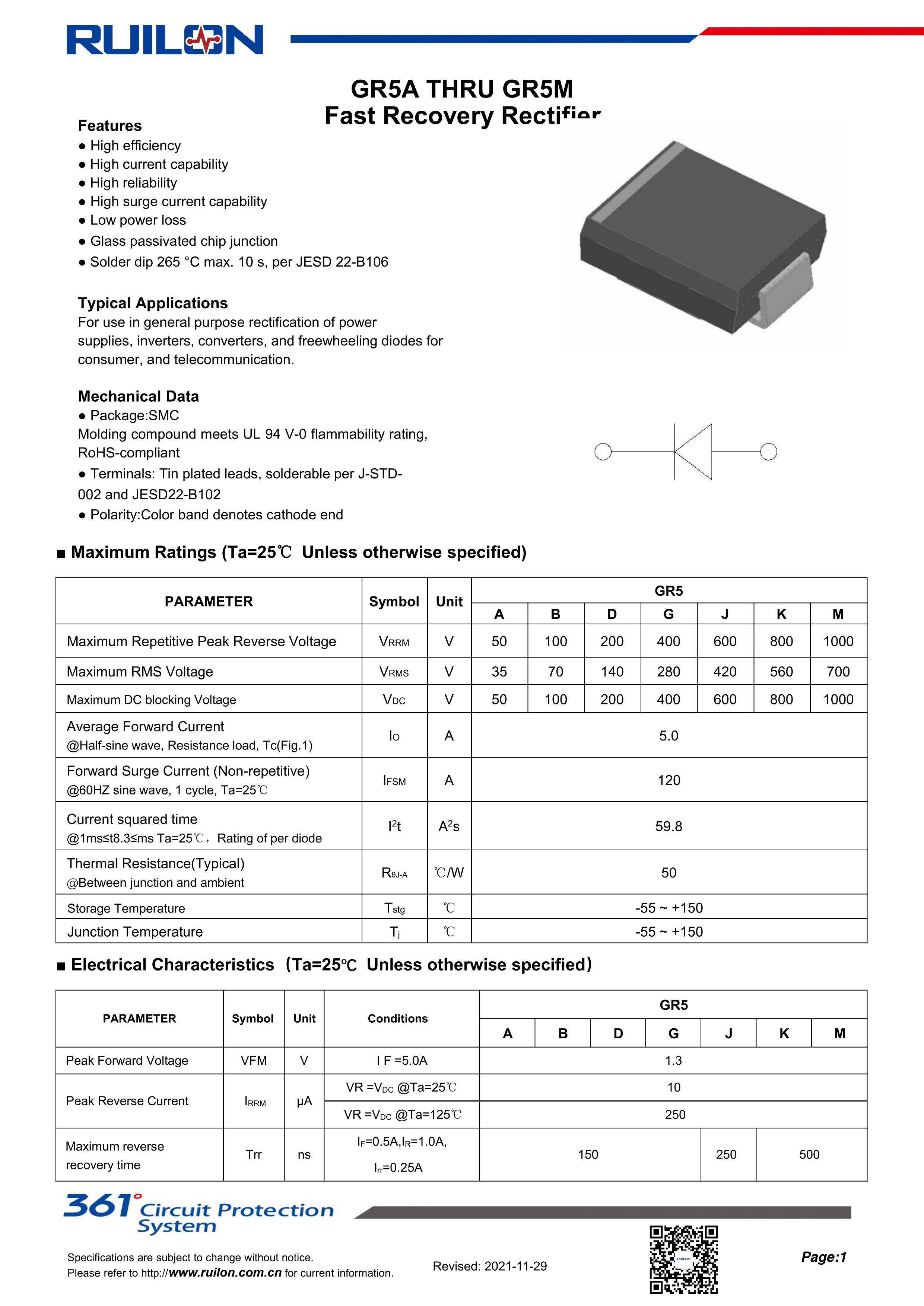 GR5M数据手册SMC封装RUILON(瑞隆源)PDF规格书,中英文下载