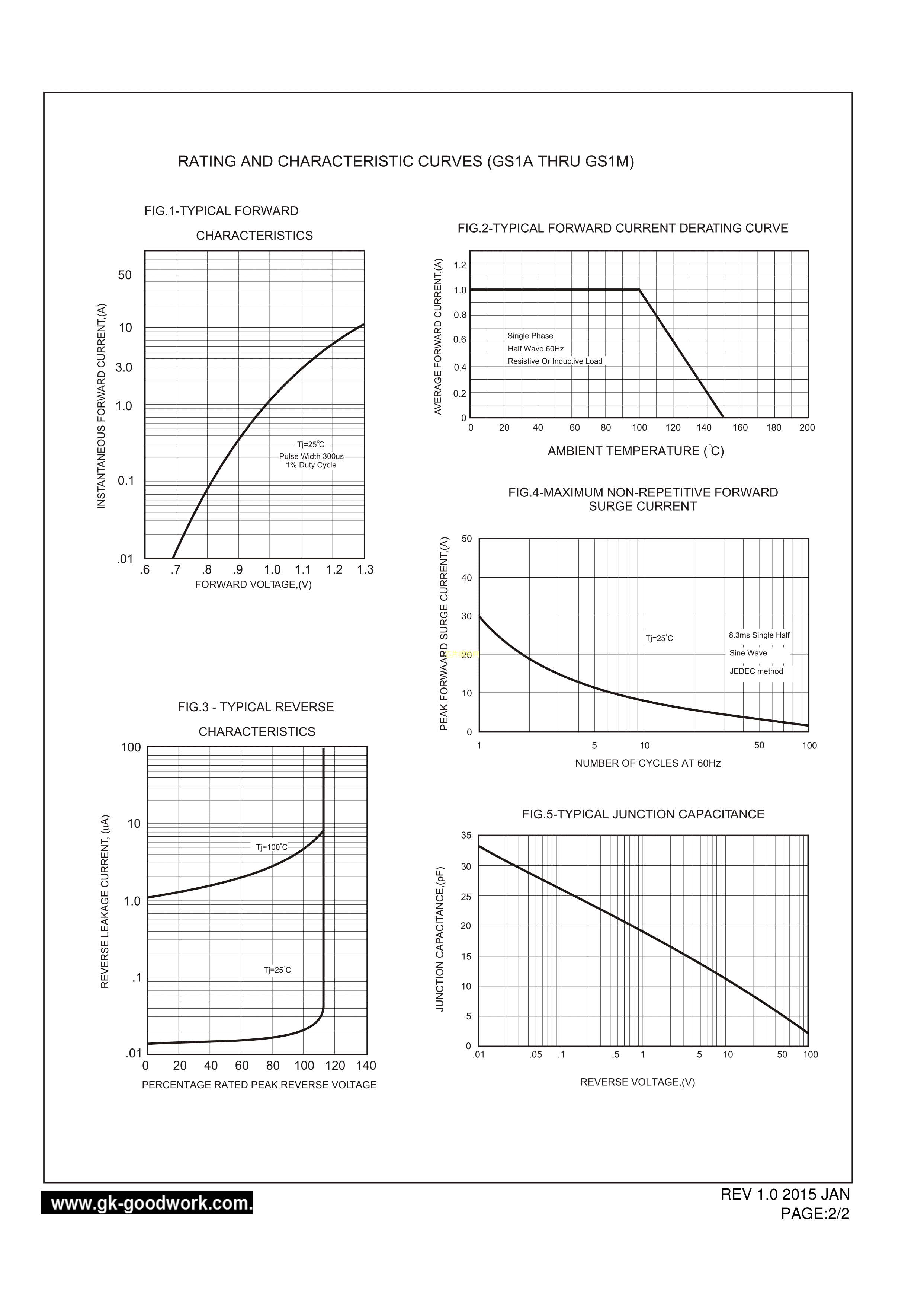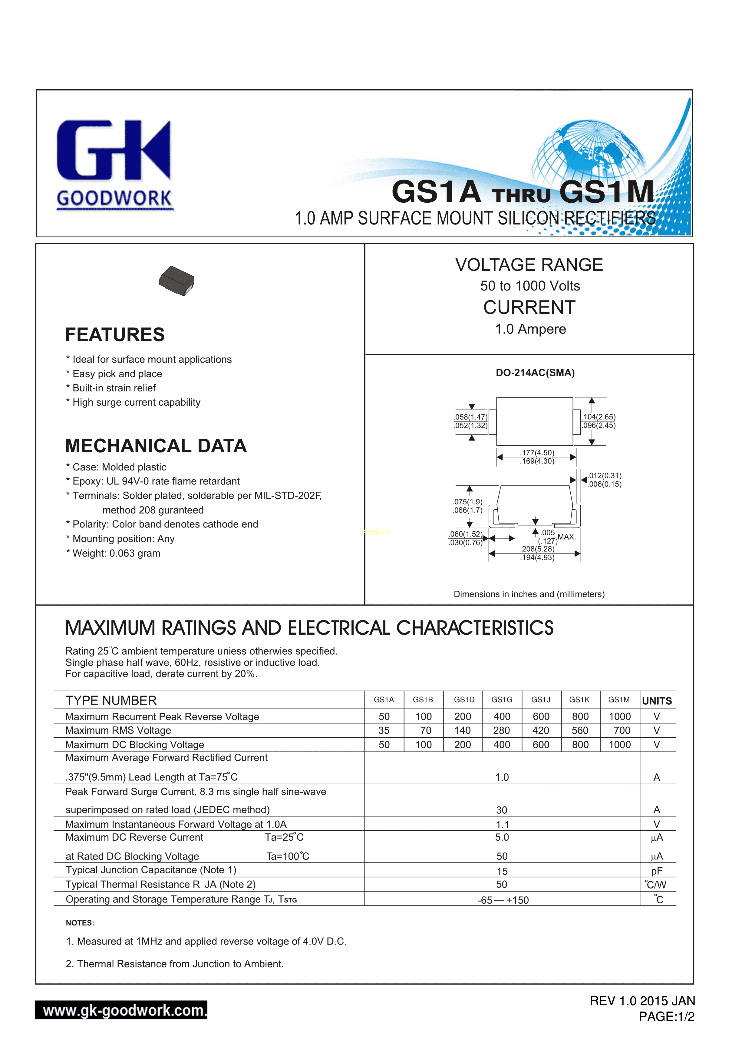 GS1M-SMA数据手册SMA(DO-214AC)封装GOODWORK(固得沃克)PDF规格书,中英文下载