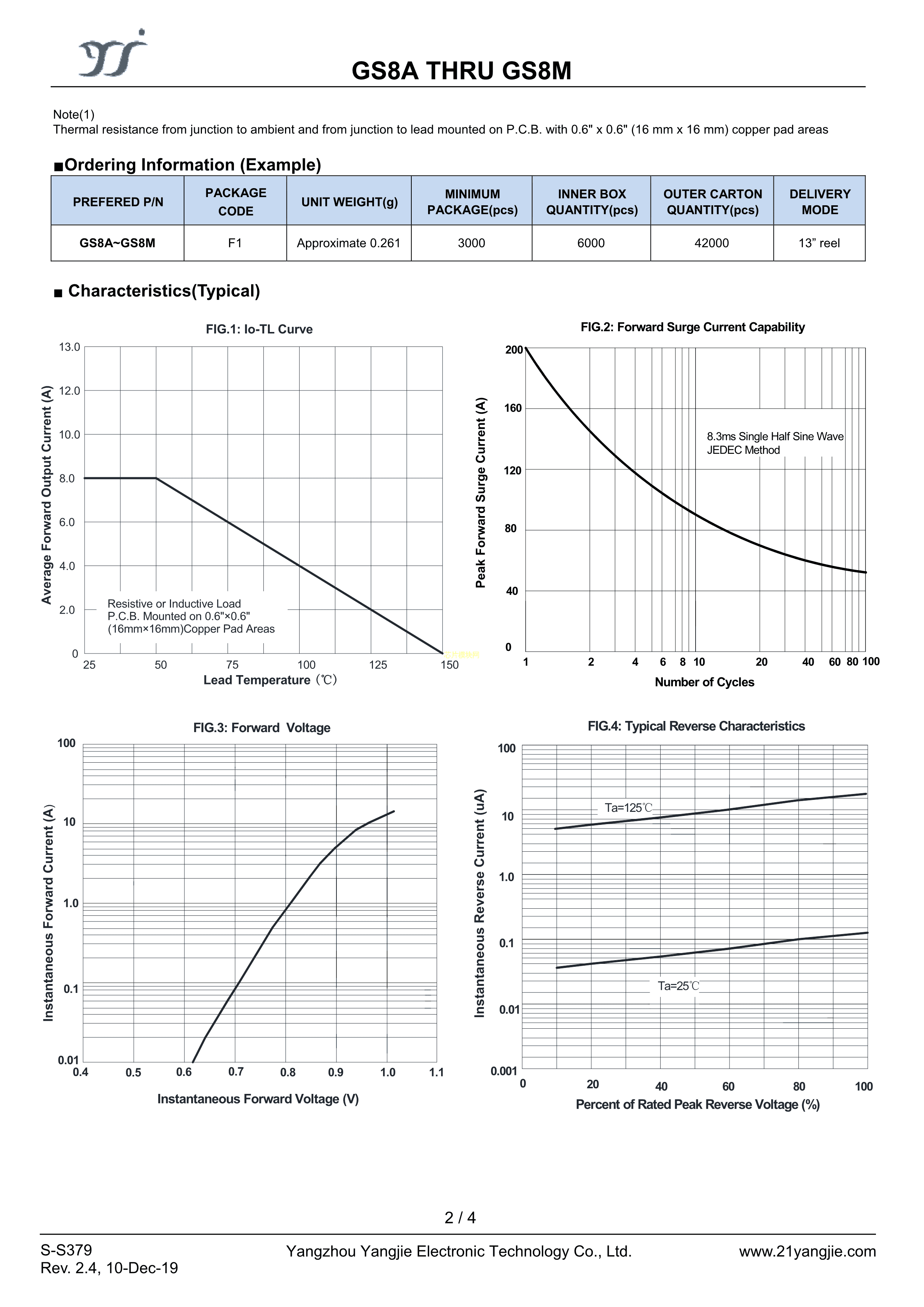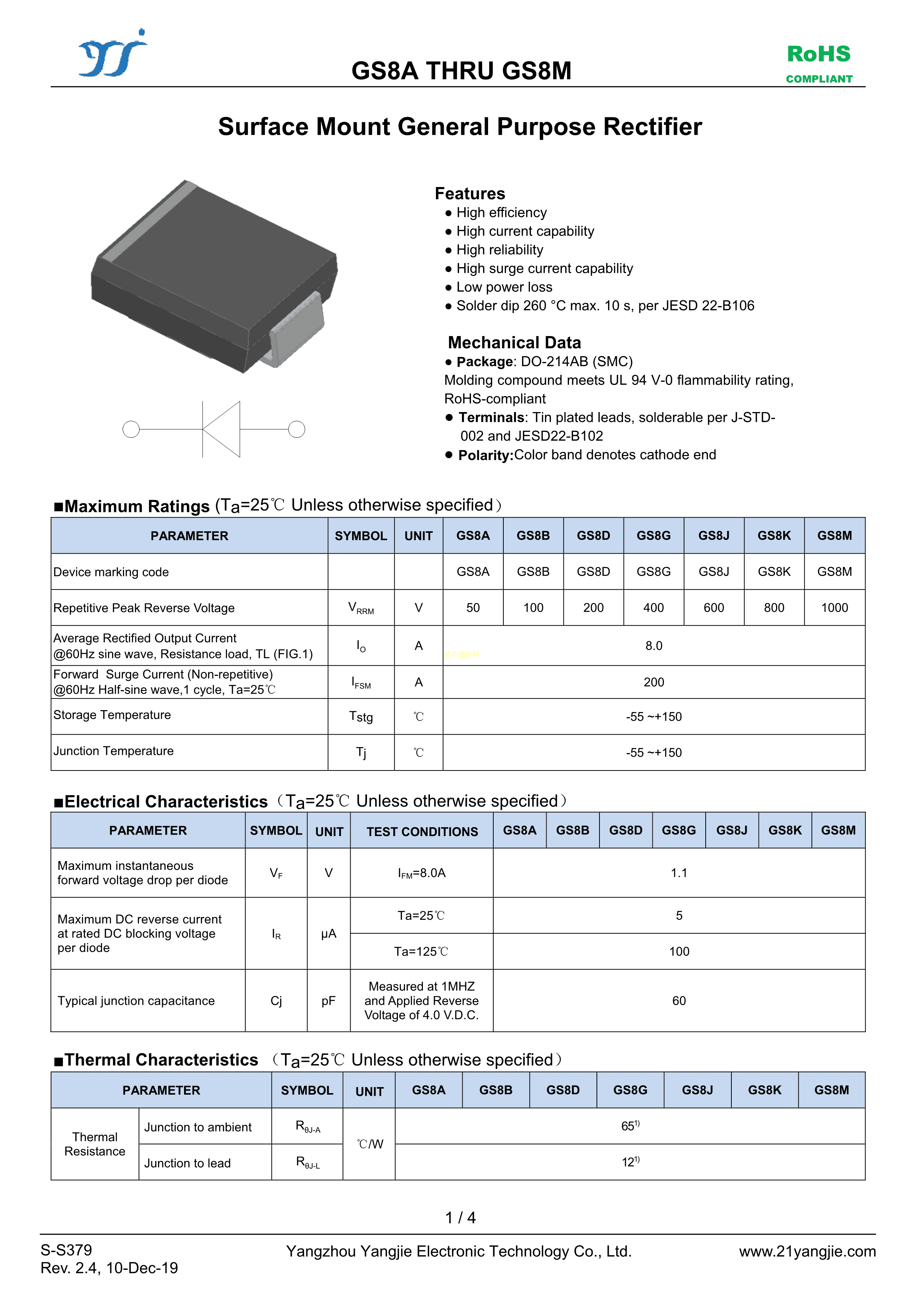 GS8M数据手册SMC(DO-214AB)封装YANGJIE(扬杰)PDF规格书,中英文下载