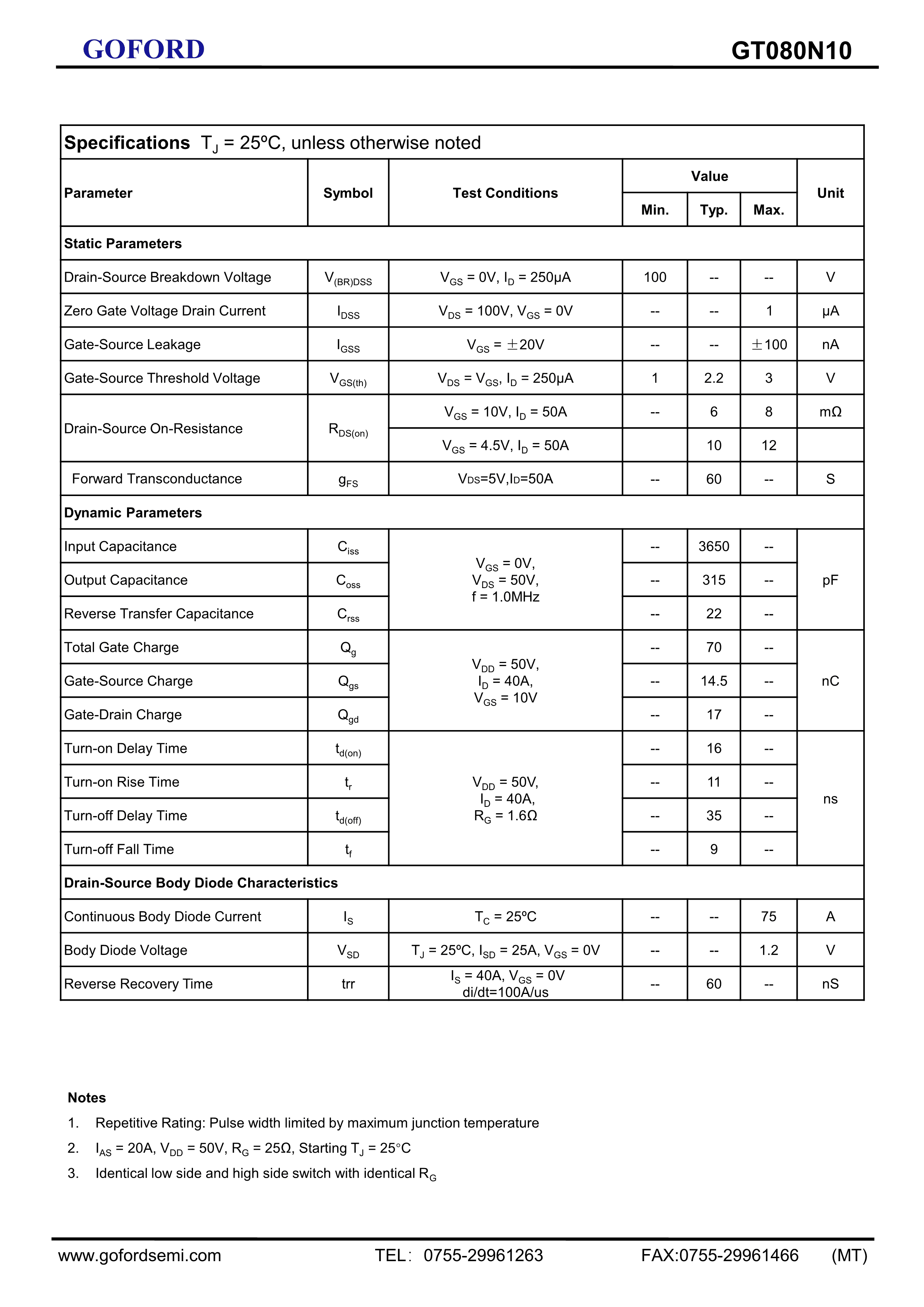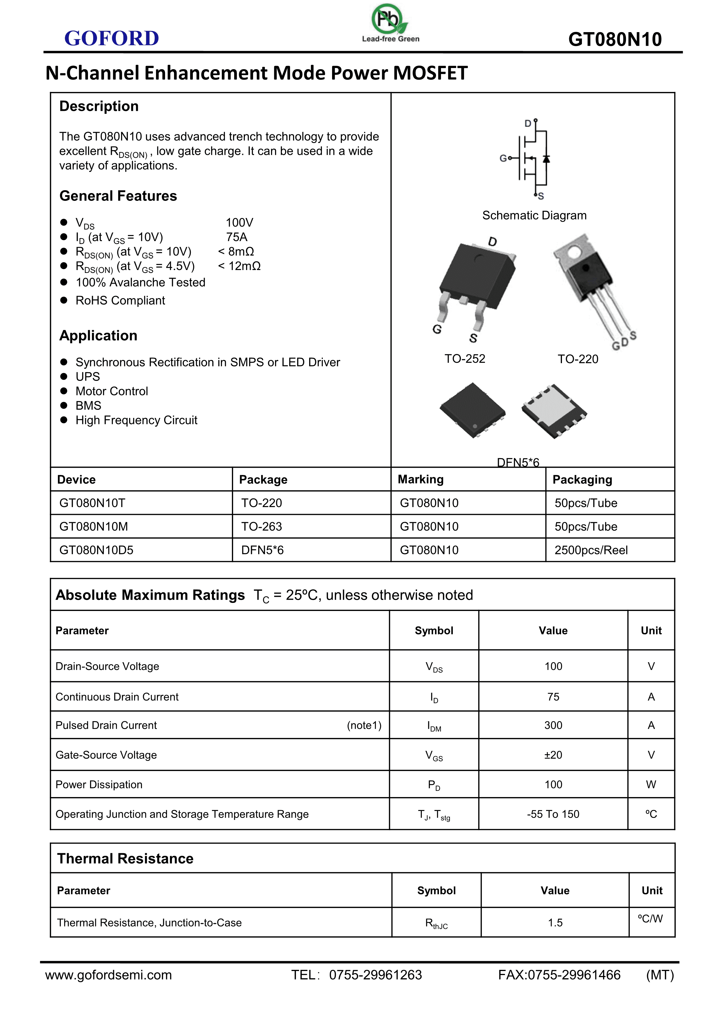 GT080N10D5数据手册DFN(5x6)封装GOFORD(谷峰)PDF规格书,中英文下载