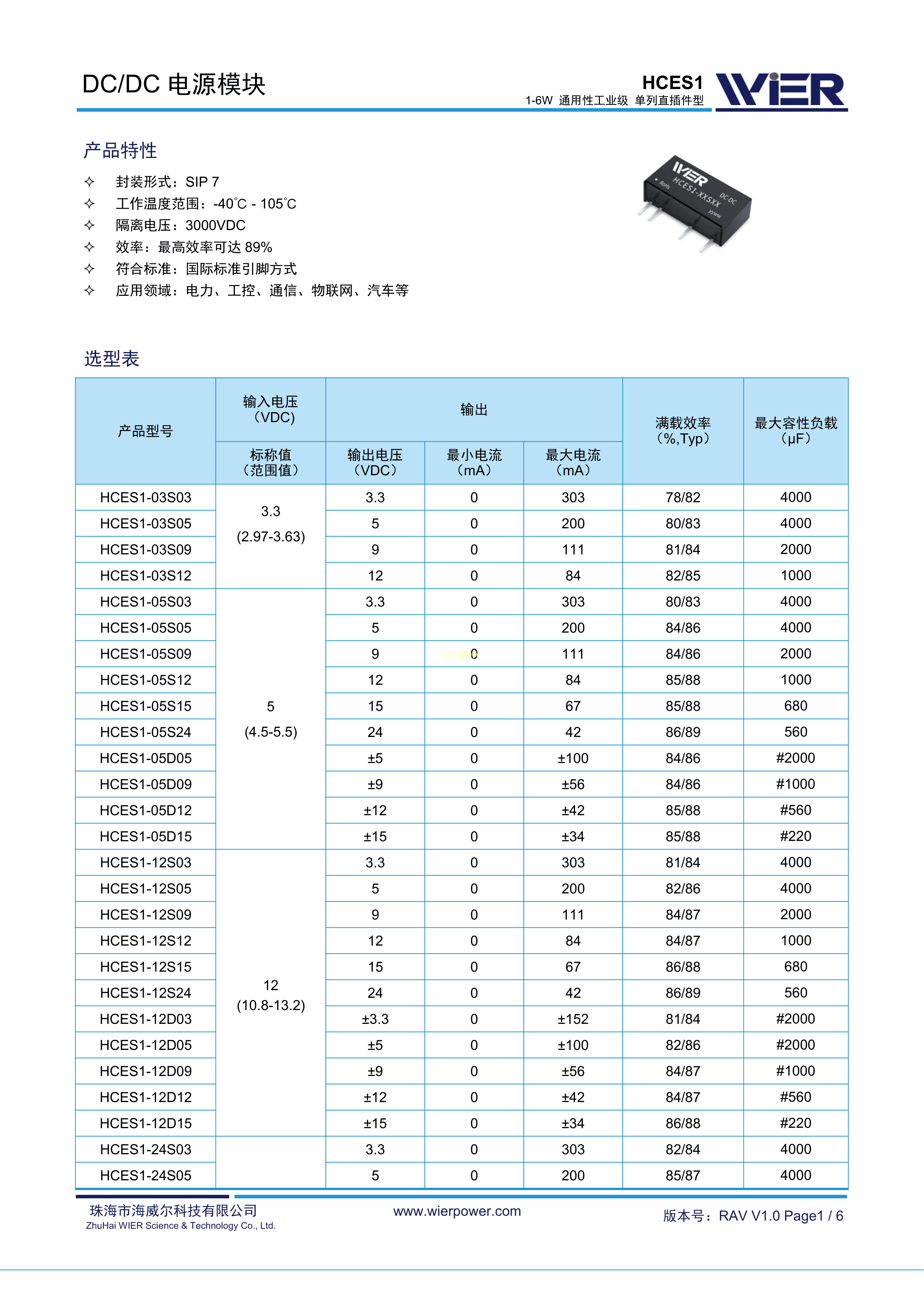 HCES1-12S15数据手册插件封装WIER(微尔)PDF规格书,中英文下载