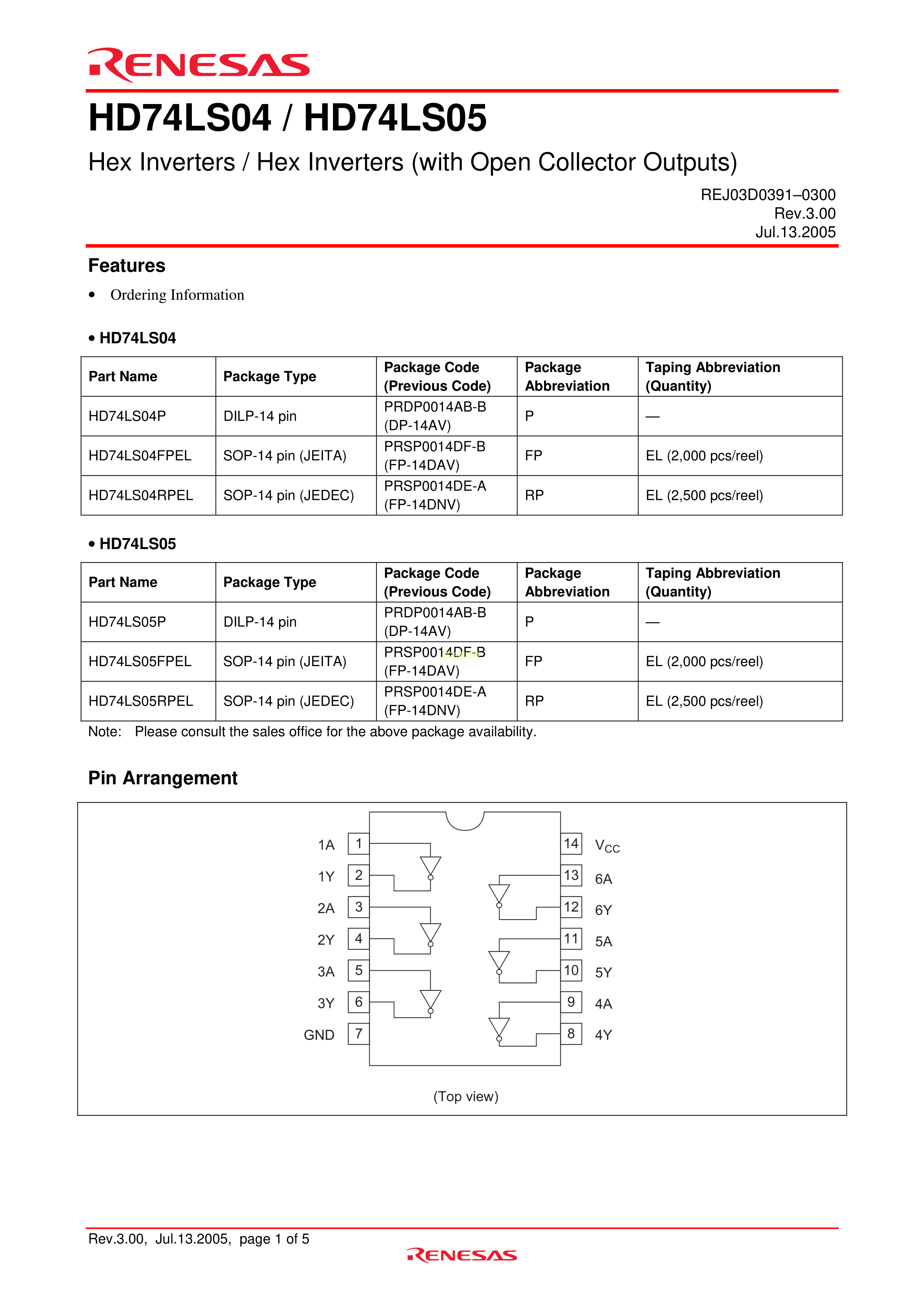 HD74LS05P数据手册DIP-14封装RENESAS(瑞萨)-IDTPDF规格书,中英文下载