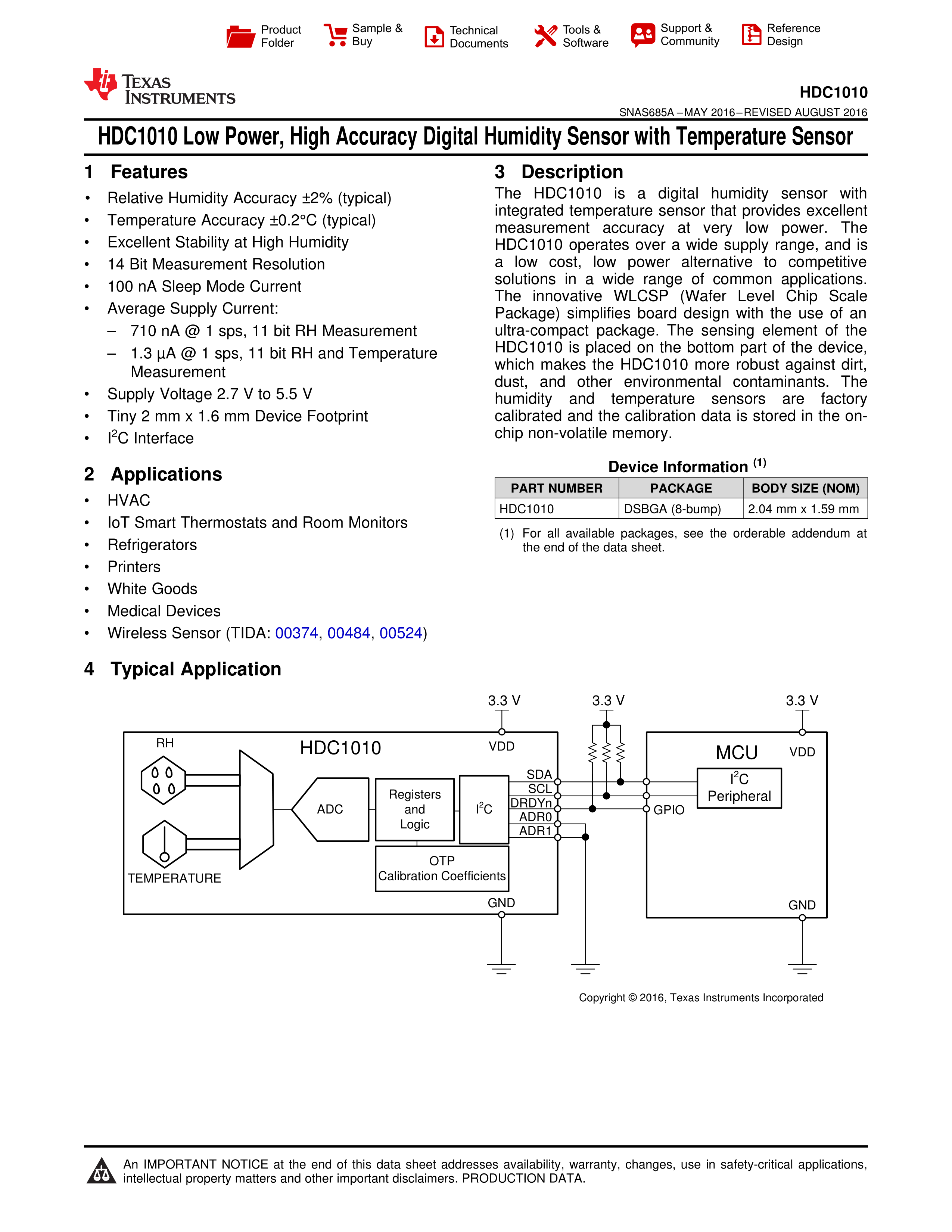 HDC1010YPAR数据手册BGA-8封装TI(德州仪器)PDF规格书,中英文下载
