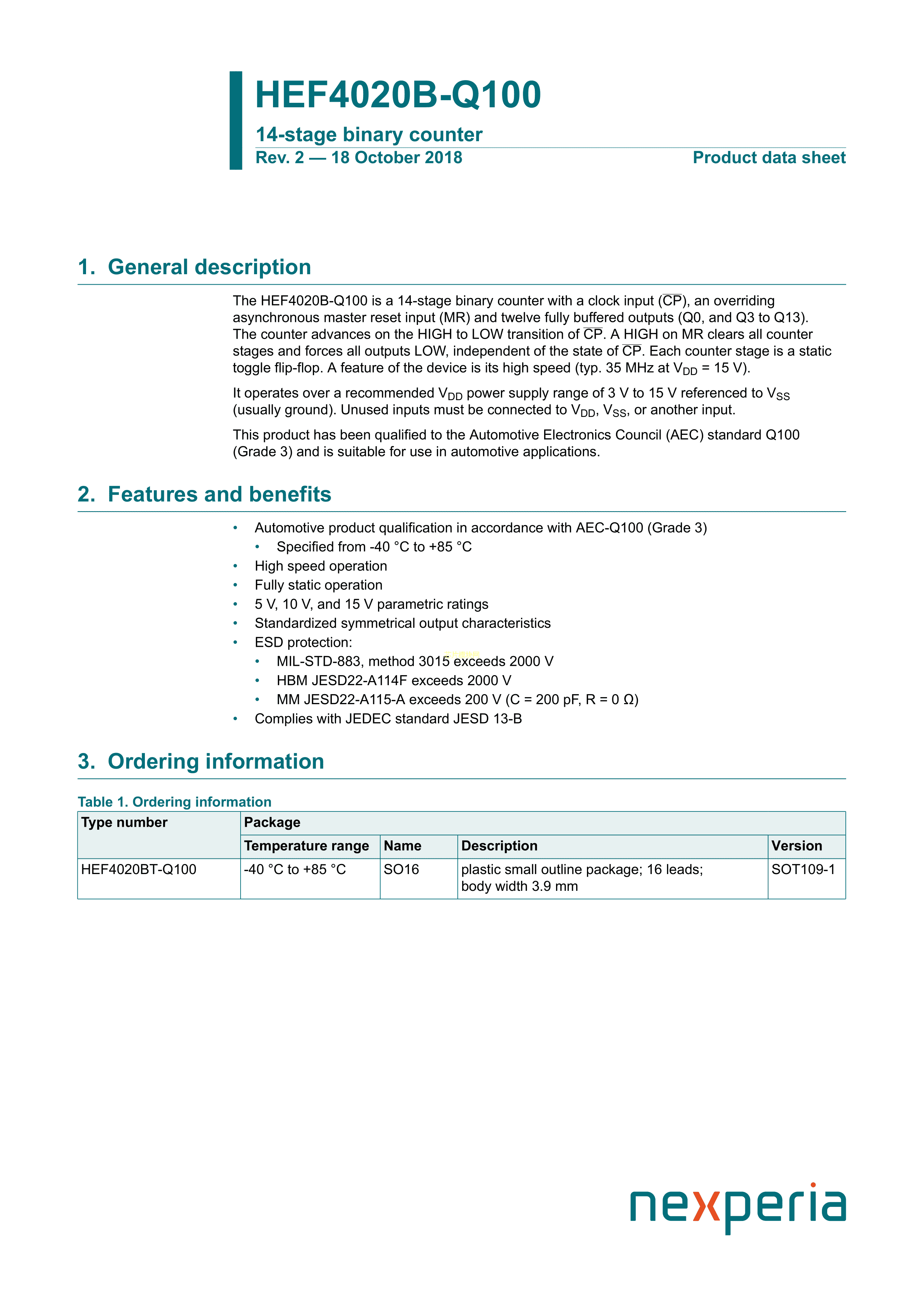 HEF4020BT-Q100J数据手册SO-16封装Nexperia(安世)PDF规格书,中英文下载